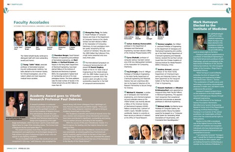 Terence Langdon, the William E. Leonhard Professor of Engineering in the Department of Aerospace and Mechanical Engineering and a professor of the Mork Family Department of Chemical Engineering and Materials Science, received the Lee Hsun Lecture Award from the Chinese Academy of Sciences Institute for Metals Research (IMR) in Shenyang, China. Andrea Armani, assistant professor of the Mork Family Department of Chemical Engin eering and Materials Science, has been appointed as the inaugural holder of the Fluor Early Career Chair in Engineering. Hossein Hashemi and Bhaskar Krishnamachari were appointed as inaugural Ming Hsieh Faculty Fellows in Electrical Engineering. The appointment recognizes their exceptional distinction and promise as associate professors in electrical engineering. Michael Arbib, the Fletcher Jones Professor of Computer Science, has received another Okawa Foundation award for his research on a “Computational System for Generating Verbal Descriptions of Visual Scenes, with Constraints from Neurolinguistics.”