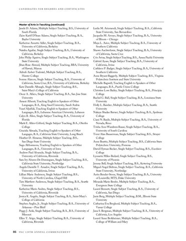Master of Arts in Teaching (continued) Janele D. Adams, Multiple Subject Teaching, B.S., University of South Florida Zaire Kariff D’Sean Adams, Single Subject Teaching, B.A., Baylor University Katherine Annette Adler, Single Subject Teaching, B.A., University of California, Berkeley Natalia Aguilar, Single Subject Teaching, B.A., University of California, Berkeley John Philip Aguirre, Single Subject Teaching, B.A., Washington State University Jihan Rose Ahmed, Multiple Subject Teaching, BBA, University of Hawaii, Manoa Adirah Aishet-Tsalmiel, Multiple Subject Teaching, B.S., Hunter College Ivonne Alarcon, Single Subject Teaching, B.A., University of California, Santa Cruz; B.S., University of California, Berkeley Kate Danielle Albaugh, Single Subject Teaching, B.S., Saint Mary’s College of California Oscar A. Alfaro, Single Subject Teaching, B.A., San Jose State University Amani Alhenti, Teaching English to Speakers of Other Languages, B.A., King Saud University, Saudi Arabia Yusef Aljuffali, Teaching English to Speakers of Other Languages, B.S., Lebanese American University, Lebanon Calyn B. Allen, Single Subject Teaching, B.A., University of Florida Mark E. Allen-Gifford, Single Subject Teaching, B.A., Oberlin College Graciela Almada, Teaching English to Speakers of Other Languges, B.A., California State University, Long Beach Heather D. Almaraz, Multiple Subject Teaching, B.S., San Diego State University Sugu Althomsons, Teaching English to Speakers of Other Languages, B.A., University of Iowa Andrew Paul Alvarado, Single Subject Teaching, B.A., University of California, Riverside Sara Ivy Alvarez De Dominguez, Single Subject Teaching, B.S., California State University, Northridge Angela Danielle T. Amador, Single Subject Teaching, B.A., University of California, Irvine Lillian Marie Anderson, Single Subject Teaching, B.S., University of North Carolina, Chapel Hill Tate Matthew Anderson, Single Subject Teaching, B.A., Seattle University Katherine Marie Andres, Single Subject Teaching, B.S., University of California, Riverside Jessica K. Angelo, Single Subject Teaching, B.A., Saint Mary’s College of California Stephen Anglin, Jr., Single Subject Teaching, B.A., University of Arkansas – Pine Bluff Peggy J. Aoki, Single Subject Teaching, B.A., B.S., University of Missouri Ellen T. Arigo, Single Subject Teaching, B.A., University of California, Riverside