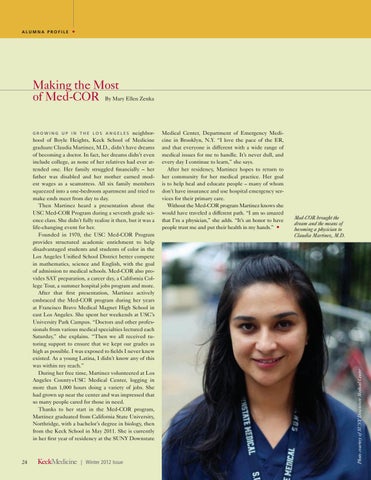 neighborhood of Boyle Heights, Keck School of Medicine graduate Claudia Martinez, M.D., didn’t have dreams of becoming a doctor. In fact, her dreams didn’t even include college, as none of her relatives had ever attended one. Her family struggled financially – her father was disabled and her mother earned modest wages as a seamstress. All six family members squeezed into a one-bedroom apartment and tried to make ends meet from day to day. Then Martinez heard a presentation about the USC Med-COR Program during a seventh grade science class. She didn’t fully realize it then, but it was a life-changing event for her. Founded in 1970, the USC Med-COR Program provides structured academic enrichment to help disadvantaged students and students of color in the Los Angeles Unified School District better compete in mathematics, science and English, with the goal of admission to medical schools. Med-COR also provides SAT preparation, a career day, a California College Tour, a summer hospital jobs program and more. After that first presentation, Martinez actively embraced the Med-COR program during her years at Francisco Bravo Medical Magnet High School in east Los Angeles. She spent her weekends at USC’s University Park Campus. “Doctors and other professionals from various medical specialties lectured each Saturday,” she explains. “Then we all received tutoring support to ensure that we kept our grades as high as possible. I was exposed to fields I never knew existed. As a young Latina, I didn’t know any of this was within my reach.” During her free time, Martinez volunteered at Los Angeles County+USC Medical Center, logging in more than 1,000 hours doing a variety of jobs. She had grown up near the center and was impressed that so many people cared for those in need. Thanks to her start in the Med-COR program, Martinez graduated from California State University, Northridge, with a bachelor’s degree in biology, then from the Keck School in May 2011. She is currently in her first year of residency at the SUNY Downstate