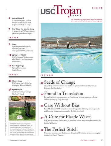 Real-world impact is also the common thread running the other feature stories in the current issue. From a technique for turning plastic garbage from the ocean into pharmaceuticals, to AI that helps surgeons improve their suturing skills, to software that offers U.S. diplomats quick translations of new stories in multiple languages, to a gender-affirming care program that helps trans people be who they are, Trojans are deploying their unique talents to leave the world better than they found it.