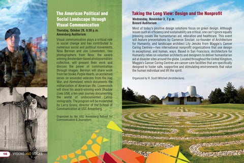 Taking the Long View: Design and the Nonprofit Wednesday, November 3, 7 p.m. Bovard Auditorium Most of today’s positive design solutions focus on green design. Although issues such as efficiency and sustainability are critical, one can’t ignore equally pressing issues like humanitarian aid, education and healthcare. This event will feature presentations by Cameron Sinclair, co-founder of Architecture for Humanity, and landscape architect Lily Jencks from Maggie’s Cancer Caring Centres—two international nonprofit organizations that use design in exceptional, and human, ways. Based in San Francisco, Architecture for Humanity relies on volunteer architects and designers to deliver humanitarian aid at disaster sites around the globe. Located throughout the United Kingdom, Maggie’s Cancer Caring Centres are cancer-care facilities that are specifically designed to foster safe, supportive and stimulating environments that value the human individual and lift the spirit. Organized by R. Scott Mitchell (Architecture).