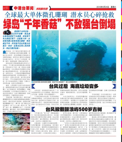 今年強颱風“莫蘭蒂”登陸福建廈 門,知名景區鼓浪嶼的古樹名木、歷史建 築和市容市貌等受到較大影響。在這次倒 伏的古樹中,最長樹齡的是一株500多年的 古樹,300年以上樹齡則有3株。 在鼓浪嶼,大量樹木日前被風刮倒, 有些攔腰折斷,有些連根拔起,其中部分 樹木歷史悠久。據思明區市政園林局相關 負責人介紹,鼓浪嶼一共有約3000株樹木 ■原本生態豐富的珊瑚礁,颱風過後慘不忍 倒伏,90%以上樹木折枝、斷枝,其中13 睹。 網上圖片 株古樹名木倒伏,156株古樹名木折枝。