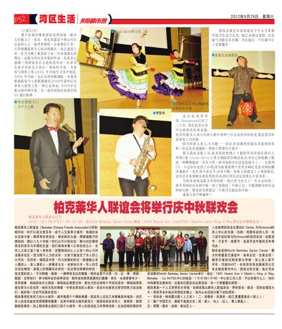 柏克萊華人聯誼會將舉行慶中秋聯歡會 柏克萊華人聯誼會訂於: 2012,10∕5日下午1:30---3:30、在North Berkeley Senior Center,地址:1901 Hearst Ave , Ca.94709 +Martin Luther King Jr Way舉行慶中秋聯歡會。 栢克萊華人聯誼會(Berkeley Chinese Friends Association)(簡稱: 栢華會,BCFA)成立很多年,由於人文薈萃之城市,每屆的會 長及參與者,都異常優秀突出,像孫耐孫大姐、厚德福餐廳的 柳媽媽,都以八九十歲啦!他們從不計較名位,都為社區提供 很多的歡樂與豐厚的友誼。他們每每本著<以老我老之心,去 作人之老之誼>或<老我老,還要特別關心人之老>的心與作 法服務社區。因為限於人力的關係,大家只敢選定了華人的三 大節慶,農曆年、端陽及中秋,作為歡聚的時光。盼望能以老 人唱老人,老人演老人。娛俺老太太,也娛他大爺。華人的藝 文在此愉悅,美國人的情趣在此歡欣。在這裡沒族群的紛擾, 在這裡的老人,不分胖瘦、高矮,一律得到無比的尊敬。栢華會更不分黑、白、紅、黃,照顧、 鼓勵、支持他們,參與栢華會的各種活動,栢華會的職責是要他們健康、快樂、永保青春年少。 吳蘋接替枊媽媽的會長之職後,柳媽媽反倒更支持,更出力的支持每個節慶的活動,柳媽媽常常 是全家大小總動員,她的無私的奉獻,令很多參加的人感動。吳會長也感責無旁貸的努力效法她 們,做好每一次的節慶聯歡活動。 栢克萊鄰近有好幾處大小城市,城市格局個個精緻典雅,而且華人過往幾年聚集逐年增加,社區 華人的活動益發變得需要而重要,這其中像較大城巿奧克蘭,就是有很多老華人、新移民,就常 跑栢克萊玩。加上栢克萊北面的三四個小城市,華人的活動近幾年異常活躍,比如說栢克萊的華