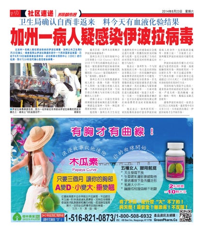 毒病人的條件,包括隔離設施 等。查維士說:「目前看上去, 加州爆發伊波拉病毒的可能性很 小。」 伊波拉病毒的傳播方式可以 通過與患者的皮膚、體液、血液 接觸得到傳染,例如使用同一個 注射針頭等,但不會通過食物、 空氣和水傳播。目前在西非已造 成超過1350人死亡,目前沒有針 對該病毒的有效治療方法。 美國疾病與預防中心指出, 通常致命類疾病的症狀包括,發 燒、嚴重頭疼、肌肉酸痛、虛 弱、痢疾、嘔吐、腹痛以及缺乏 食慾等。 感染伊波拉病毒後,症狀會 在2至21天間顯現,通常集中在8 天至10天。只有症狀出現後,伊 波拉病毒才會開始傳染。