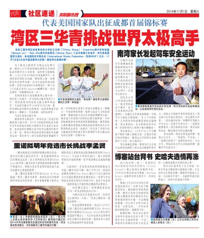 灣區三華青挑戰世界太極高手 來自三藩市灣區柏克萊加州大學的王玉婷(Tiffany Wang)、Cupertino高中的林鉑盛 (Benson Lin)、Palo Alto高中的趙君泓(Winnie Zhao)三名華裔青少年選手,將代表美國 國家太極隊,參加國際武術聯合會(International Wushu Federation,簡稱IWUF)主辦,11 月1日至4日在中國成都舉辦的第一屆世界太極錦標賽。 為了推動太極拳作為奧運會比賽專 案,擁有144個國家和地區團體會員的國 際武術聯合會主辦的第一屆世界太極錦標 賽,11月1日至4日將在中國成都舉行,美 國國家隊領隊許瑪麗,教練鄒雲建。參賽 隊伍來自世界各地,分為專業組和業餘組 比賽。美國專業組的6名參賽選手,除了以 上3名選手來自Cupertino峨嵋學院,還有 芝加哥、華盛頓特區各一名。 美國國家隊專業組教練鄒雲建介紹, 灣區的三名選手,學習競技太極分別有3-5 ■代表美國國家太極隊,參加第一屆世界太極錦標 年 , 曾 經 獲 得 美 國 競 技 太 極 大 賽 單 項 冠 賽的王玉婷,林鉑盛。 軍。專業組年齡介乎16歲至35歲之間,要 符合國際武術聯合會的要求,包括參賽選手的 同。評判標準會著重於對選手的爆發力、彈跳 力、節奏韻律的掌握、肢體與意念氣力的高度 爆發力、彈跳力、節奏韻律、動作標準等。 協調、情感表演力及功夫實戰的理解等方面。 與高手競技實屬不易 據前世界太極冠軍、培養出這三位選手的 要求選手在短短3分鐘的比賽全面體現。平時 教練鄒雲建介紹,與FIFA同級的國際武術聯 訓練就要求對身體素質的極限挑戰。通常國際 合會舉辦的此次國際大賽將分為專業組與業餘 大賽參賽的亞洲選手都是國家經費培養並且全 組。業餘組的比賽跟大家平時對太極的印象並 職訓練的運動員,而此次三位代表了美國專業 無二致,是一種老少皆宜的柔和紓緩的有氧健 太極最高水準的選手將與亞洲的專業太極運動 身運動,重在參與;而專業組的要求則截然不 員同台競賽,實屬不易。