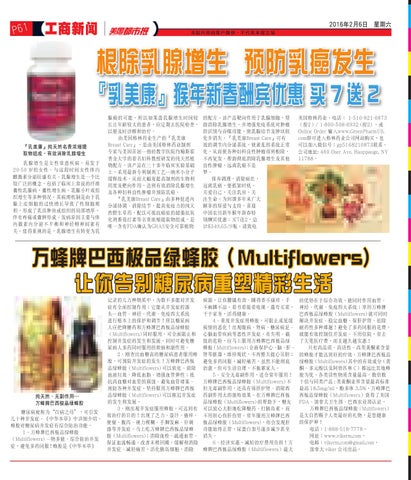 的優勢在於綜合功效,能同時作用血管、 神經、代謝、免疫四大系統;單用萬蜂牌 巴西極品綠蜂膠(Multiflowers) 就可同時 解決併發症、穩定血糖、保肝護腎、祛除 耐藥性多種難題!避免了多藥同服的花費, 就能有效控制住併發症、不用住院,省去 了大筆醫療費,而且越久越實惠! 只有高品質、高活性、高類黃酮素含量 的蜂膠才能達到好的療效。萬蜂牌巴西極品 綠蜂膠(Multiflowers) 其中的有效成分(黃 酮、多元酚以及阿替匹林 C)都遠比其他蜂 膠為優。各類活性物質含量最高,數倍數 十倍與同類產品 : 類黃酮業界含量最高標準 最高 18.5mg/ml,酚多體 3.5%。萬峰牌巴 西極品綠蜂膠(Multiflowers)獲得了美國 FDA、加拿大衛生部、巴西農業部認證。 萬蜂牌巴西極品綠蜂膠(Multiflowers) 是大自然賜予人類最好的禮物,是您健康 的保護神! 電話:1-888-518-7778, 網址:www.vikerm.com, 電郵:vikerm.com@gmail.com, 加拿大 viker 公司出品。