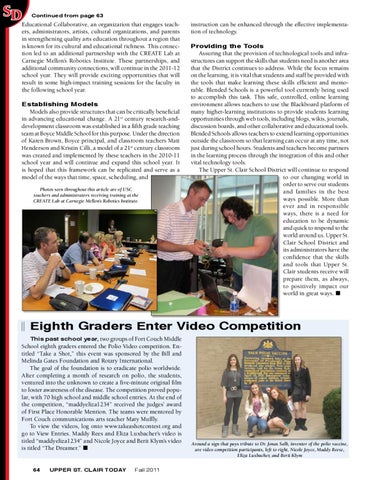 instruction can be enhanced through the effective implementation of technology. Providing the Tools Assuring that the provision of technological tools and infrastructures can support the skills that students need is another area that the District continues to address. While the focus remains on the learning, it is vital that students and staff be provided with the tools that make learning these skills efficient and memorable. Blended Schools is a powerful tool currently being used to accomplish this task. This safe, controlled, online learning environment allows teachers to use the Blackboard platform of many higher-learning institutions to provide students learning opportunities through web tools, including blogs, wikis, journals, discussion boards, and other collaborative and educational tools. Blended Schools allows teachers to extend learning opportunities outside the classroom so that learning can occur at any time, not just during school hours. Students and teachers become partners in the learning process through the integration of this and other vital technology tools. The Upper St. Clair School District will continue to respond to our changing world in order to serve our students and families in the best ways possible. More than ever and in responsible ways, there is a need for education to be dynamic and quick to respond to the world around us. Upper St. Clair School District and its administrators have the confidence that the skills and tools that Upper St. Clair students receive will prepare them, as always, to positively impact our world in great ways. n