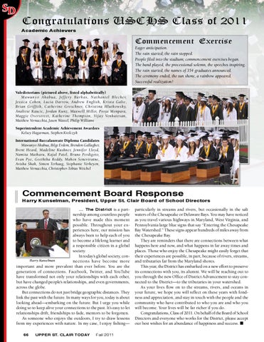 Harry Kunselman, President, Upper St. Clair Board of School Directors … The District is a partnership among countless people who have made this moment possible. Throughout your experiences here, our mission has always been to help each of you to become a lifelong learner and a responsible citizen in a global society. In today’s global society, conHarry Kunselman nections have become more important and more prevalent than ever before. You are the generation of connections. Facebook, Twitter, and YouTube have transformed not only your relationships with each other, but have changed people’s relationships, and even governments, across the globe. But connections do not just bridge geographic distances. They link the past with the future. In many ways for you, today is about looking ahead—embarking on the future. But I urge you while doing so to keep alive your connections to the past. It’s easy to let relationships drift, friendships to fade, mentors to be forgotten. As someone who enjoys the outdoors, I try to draw lessons from my experiences with nature. In my case, I enjoy fishing— 66