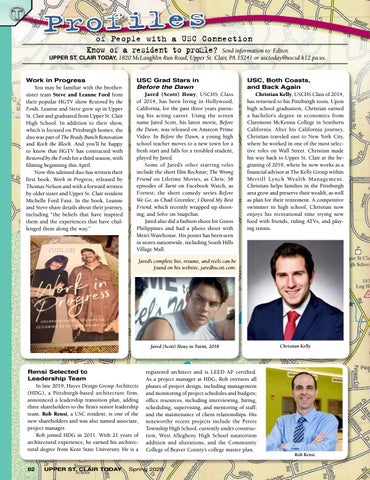 UPPER ST. CLAIR TODAY, 1820 McLaughlin Run Road, Upper St. Clair, PA 15241 or usctoday@uscsd.k12.pa.us. Work in Progress You may be familiar with the brothersister team Steve and Leanne Ford from their popular HGTV show Restored by the Fords. Leanne and Steve grew up in Upper St. Clair and graduated from Upper St. Clair High School. In addition to their show, which is focused on Pittsburgh homes, the duo was part of The Brady Bunch Renovation and Rock the Block. And you’ll be happy to know that HGTV has contracted with Restored by the Fords for a third season, with filming beginning this April. Now this talented duo has written their first book, Work in Progress, released by Thomas Nelson and with a forward written by older sister and Upper St. Clair resident Michelle Ford Faist. In the book, Leanne and Steve share details about their journey, including “the beliefs that have inspired them and the experiences that have challenged them along the way.”