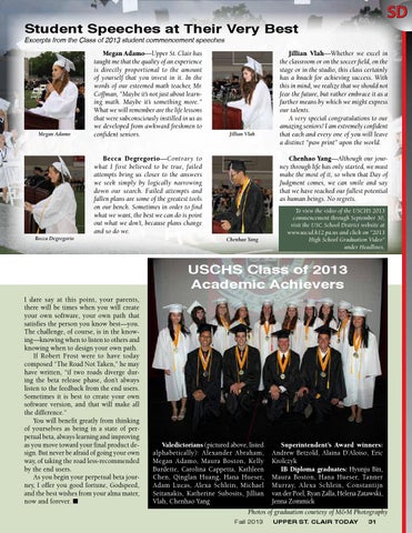 USCHS Class of 2013 Academic Achievers I dare say at this point, your parents, there will be times when you will create your own software, your own path that satisfies the person you know best—you. The challenge, of course, is in the knowing—knowing when to listen to others and knowing when to design your own path. If Robert Frost were to have today composed “The Road Not Taken,” he may have written, “if two roads diverge during the beta release phase, don’t always listen to the feedback from the end users. Sometimes it is best to create your own software version, and that will make all the difference.” You will benefit greatly from thinking of yourselves as being in a state of perpetual beta, always learning and improving as you move toward your final product design. But never be afraid of going your own way, of taking the road less-recommended by the end users. As you begin your perpetual beta journey, I offer you good fortune, Godspeed, and the best wishes from your alma mater, now and forever. n