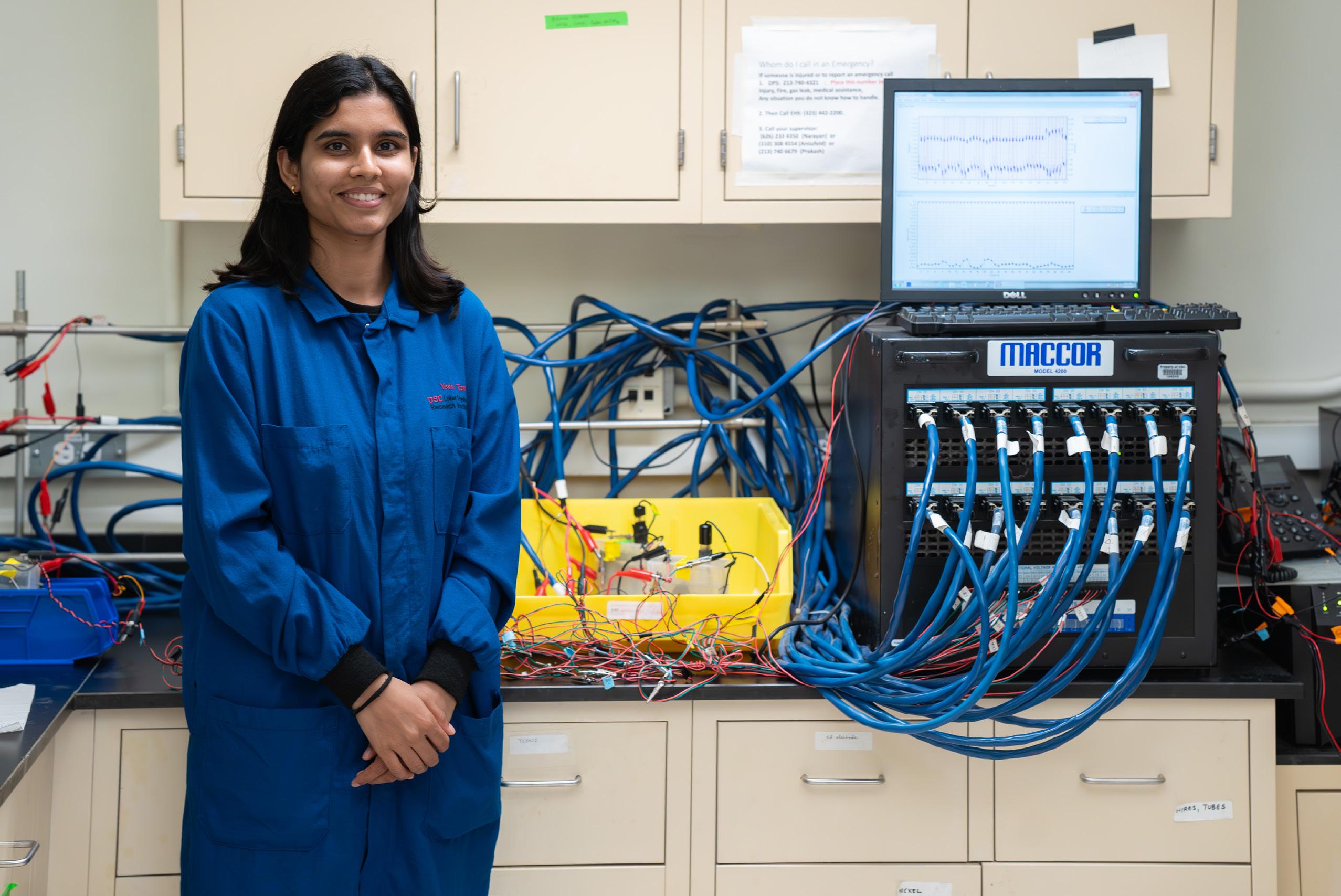 Chemistry Ph.D. student and 2024 Graduate Fellow Yeshvi Tomar in the lab. Tomar studies the use of iron electrodes in large-capacity batteries, which currently rely primarily on lithium and lead. Those two metals, however, have significant efficiency issues. In addition, lithium is both rare and prone to explosions and fires. Iron is more efficient than the other metals, and stabler and far more plentiful than lithium.