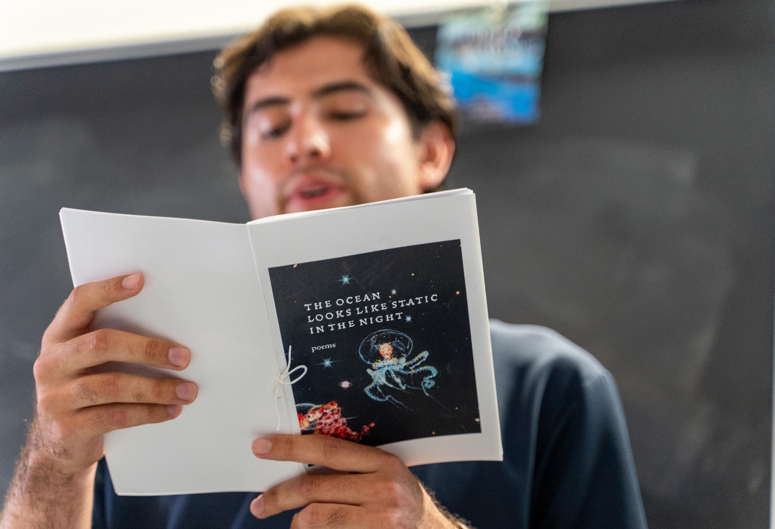 English major Mario Castellanos reads from a poetry chapbook created for the 2024 Wrigley Institute Julymester English course Writ in Water: A Creative Writing Lab on Catalina Island. The course immersed students in the island’s ecology, which served as inspiration for writing about the marine environment.
