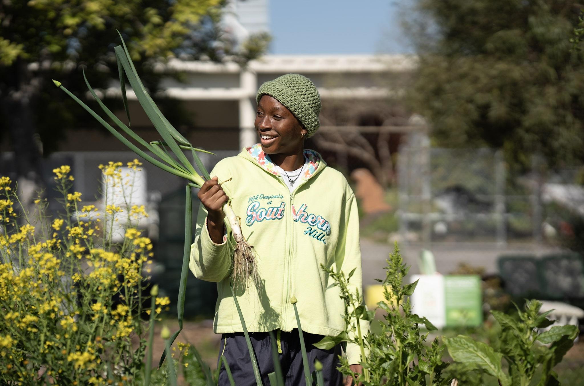 Environmental studies major Muna Obiefule holds produce she has just harvested from the garden at 24th Street Elementary School. As a student in ENST 492: Directed Environmental Policy and Science Internship, Obiefule was matched with the Garden School Foundation. The organization operates school gardens where students can learn about environmental stewardship, sustainable agriculture, and related topics.