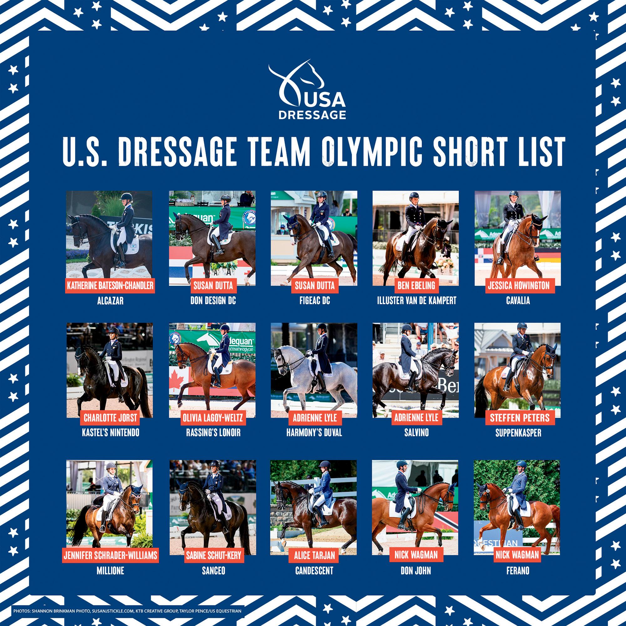 US Equestrian on April 28 announced its dressage short list—12 riders and a total of 15 riderhorse combinations—for the Tokyo 2020 Olympic Games: