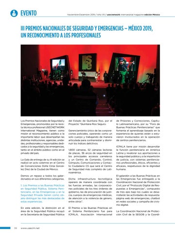de Prisiones y Correcciones, Capítulo Latinoamericano, por su “Foro de Buenas Prácticas Penitenciarias” que fomenta el aprendizaje basado en la experiencia de quienes están o estuvieron involucrados en la operación de centros penitenciarios. ICPALA tiene por misión desarrollar la función penitenciaria en América Latina y revalorar sus aportaciones a la seguridad pública y a la impartición de justicia, con sistemas penitenciarios profesionales, éticos, eficientes y eficaces, respetuosos de la dignidad humana. El galardón a las Buenas Prácticas en las Emergencias fue entregado a la Coordinación Nacional de Protección Civil, por el “Protocolo Digital de Respuestas a Emergencias”, compuesto de tres ejes bajo los cuales se desarrollarán las actividades de respuesta: página web de emergencias, chatbot en redes sociales y campaña de civismo digital. La Coordinación Nacional de Protección Civil de la SEGOB y la Coordi-