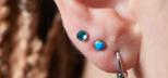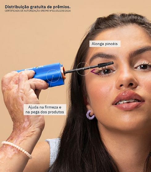 Temos a foto de uma jovem. Ela está em frente a um fundo de cor bege, de frente para a câmera, aplicando um rímel nos cílios com a mão direita. A jovem é parda, tem os cabelos castanhos, lisos e compridos com a franja presa para trás. Ela usa maquiagem em toda a face, com blush nas maçãs do rosto, brilho nos lábios e um delineado gráfico de cor roxa ao redor dos olhos. Também usa brincos de argola na cor lilás e uma blusa sem mangas na cor azul-claro. No pulso direito, uma pulseira de contas na cor salmão. Na mão direita, a base do pincel aplicador de rímel tem um engrossador. O acessório tem um formato de estrela, com as pontas arredondadas e cor azul. No centro, próximo ao pincel aplicador, os textos: “Alonga pincéis” e “Ajuda na firmeza e na pega dos produtos”.
