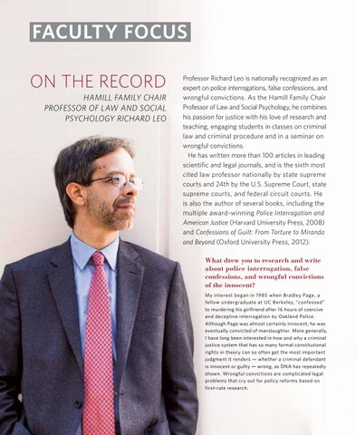 Professor Richard Leo is nationally recognized as an expert on police interrogations, false confessions, and wrongful convictions. As the Hamill Family Chair Professor of Law and Social Psychology, he combines his passion for justice with his love of research and teaching, engaging students in classes on criminal law and criminal procedure and in a seminar on wrongful convictions. He has written more than 100 articles in leading scientific and legal journals, and is the sixth most cited law professor nationally by state supreme courts and 24th by the U.S. Supreme Court, state supreme courts, and federal circuit courts. He is also the author of several books, including the multiple award-winning Police Interrogation and American Justice (Harvard University Press, 2008) and Confessions of Guilt: From Torture to Miranda and Beyond (Oxford University Press, 2012). What drew you to research and write about police interrogation, false confessions, and wrongful convictions of the innocent? My interest began in 1985 when Bradley Page, a fellow undergraduate at UC Berkeley, “confessed” to murdering his girlfriend after 16 hours of coercive and deceptive interrogation by Oakland Police. Although Page was almost certainly innocent, he was eventually convicted of manslaughter. More generally, I have long been interested in how and why a criminal justice system that has so many formal constitutional rights in theory can so often get the most important judgment it renders — whether a criminal defendant is innocent or guilty — wrong, as DNA has repeatedly shown. Wrongful convictions are complicated legal problems that cry out for policy reforms based on first-rate research.