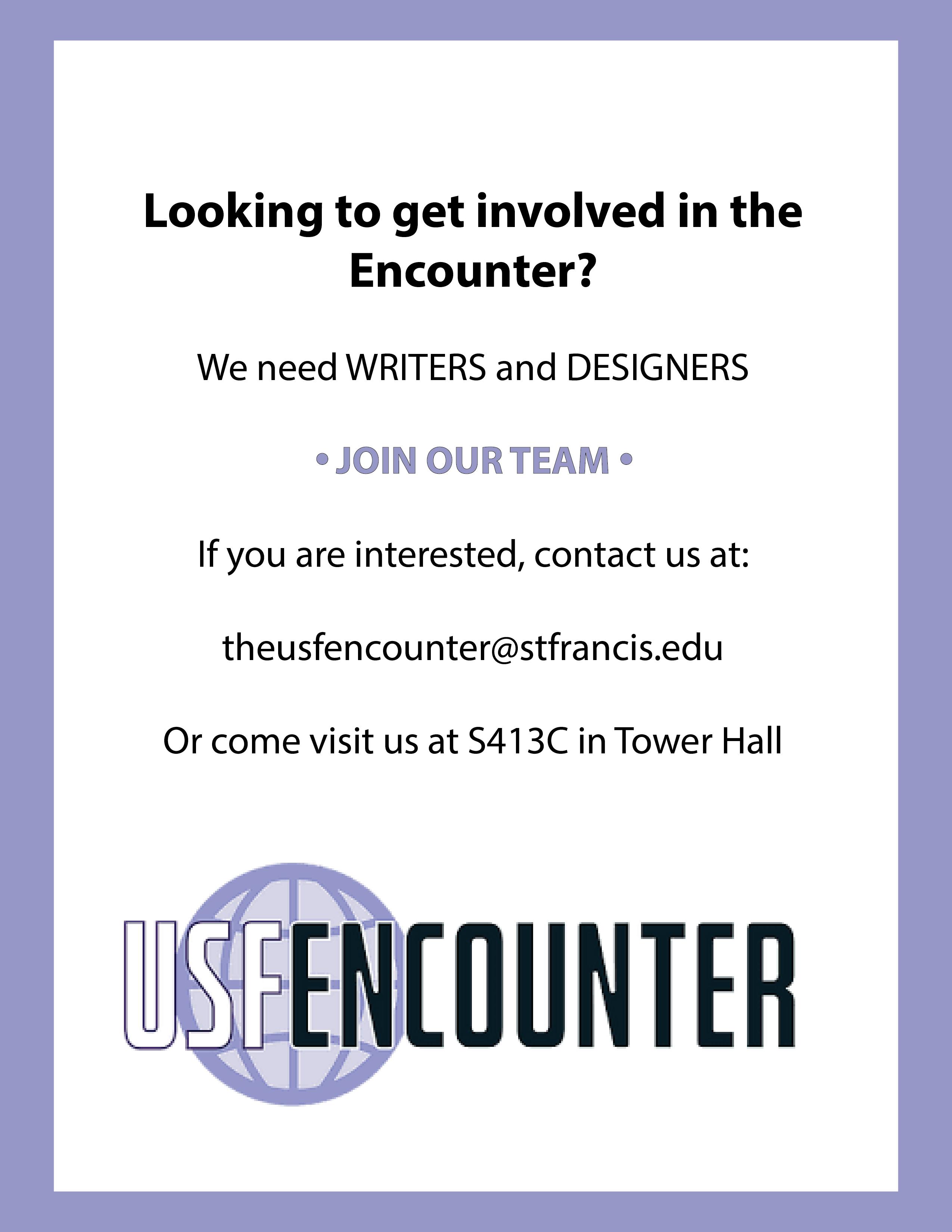 Over here at the Encounter, we encourage everyone to get involved whether you know how to design or write, we would love for you to join our team! If you have any questions on how to join us, email me at valeriereyes@stfrancis.edu.
