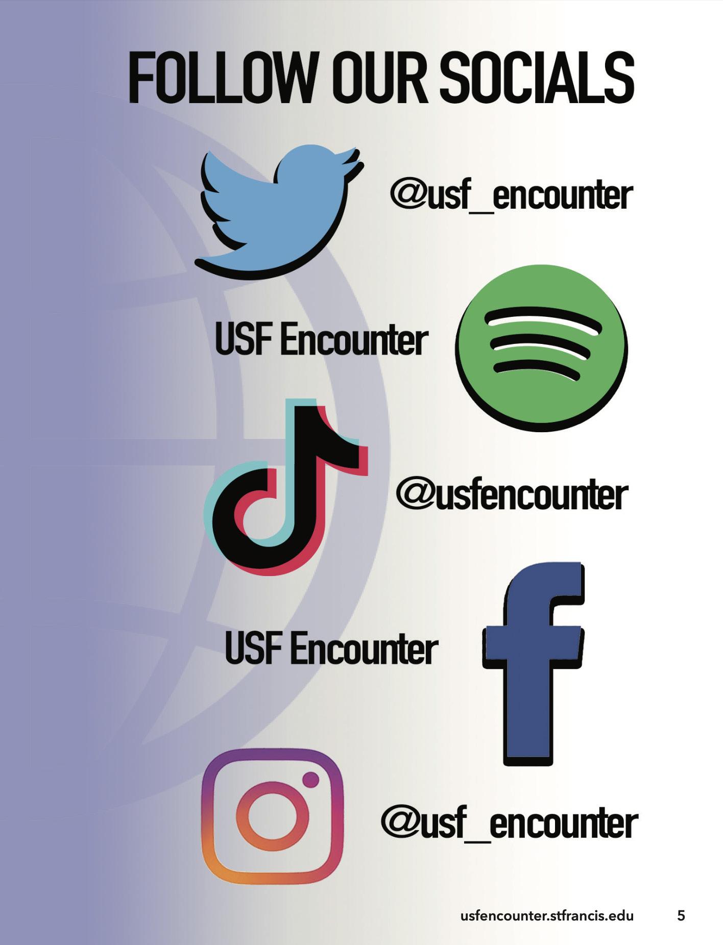 As a member of USF Campus Media, the USF Encounter strives to produce a publication that stresses quality writing and design.By reporting on issues that may be sensitive in nature, the USF Encounter aims to educate, inform and persuade students on topics that affect their lives on and off campus. Editorial pages provide USF Encounter staff with opportunities to express thoughtful views on controversial topics. Letters to the Editor represent the opinion of the author and are not necessarily opinions of the USF Encounter Staff. Publications of letters to the editor are subject to space availability and management discretion. Letters are also subject to editing. Letters to the editor or any other submissions may be dropped off at the USF Encounter office or emailed to encounter@stfrancis.edu. The USF Encounter is printed by RICOH Services on the campus of the University of St. Francis.