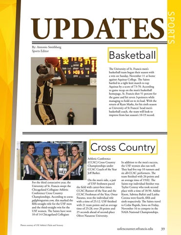 Basketball The University of St. Francis men’s basketball team began their season with a win on Sunday, November 11 at home against Aquinas College. The Saints battled in a tight knit match to top Aquinas by a score of 73-70. According to game recap on the men’s basketball homepage, St. Francis shot 51 percent for the game and hit seven 3-pointers while managing to hold on to its lead. With the return of Ryan Marks, for his sixth season as University of St Francis’ head men’s basketball coach, the team will look to improve from last season’s 10-19 record.