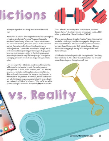 The Ordinary.” University of St. Francis senior, Elizabeth Ponce, shares, “I absolutely love my new skincare routine. Half of the products I use I found thanks to TikTok!” Due to increased usage of masks, “maskne” (acne from wearing masks for a prolonged time) became a popular skin problem that many had to face. The stresses of the year wreaked havoc on many faces. However, the daily habit of using a skincare routine has many people leaving 2021 with great skin and better attitudes. 2021 has been relatively predictable through trends. One thing that won’t stay in 2021 is how these trends affect our lives and our ability to improve throughout each year.