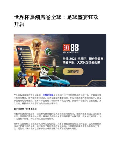 在全球体育赛事的宏大体系中,世界杯买球与世界杯投注已不仅是简单的预测行为,更随着世界 杯热度的攀升,成为球迷群体讨论、互动与连接的重要纽带。作为全球范围内影响力最广、商业 价值最高的足球盛会,世界杯早已超越了单纯的体育竞技范畴,演变成一个融合了信息传播、文 化交流、科技应用及数字互动的综合性全球平台。
