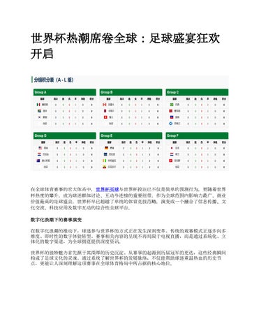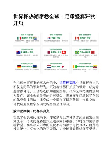 在数字化浪潮的推动下,球迷参与世界杯的方式正在发生深刻变革。传统的观赛模式正逐步向多 维度、即时性的数字体验转型。赛事相关内容的呈现不再局限于电视直播,而是通过系统化、立 体化的数字渠道,为全球拥趸提供深度资讯。