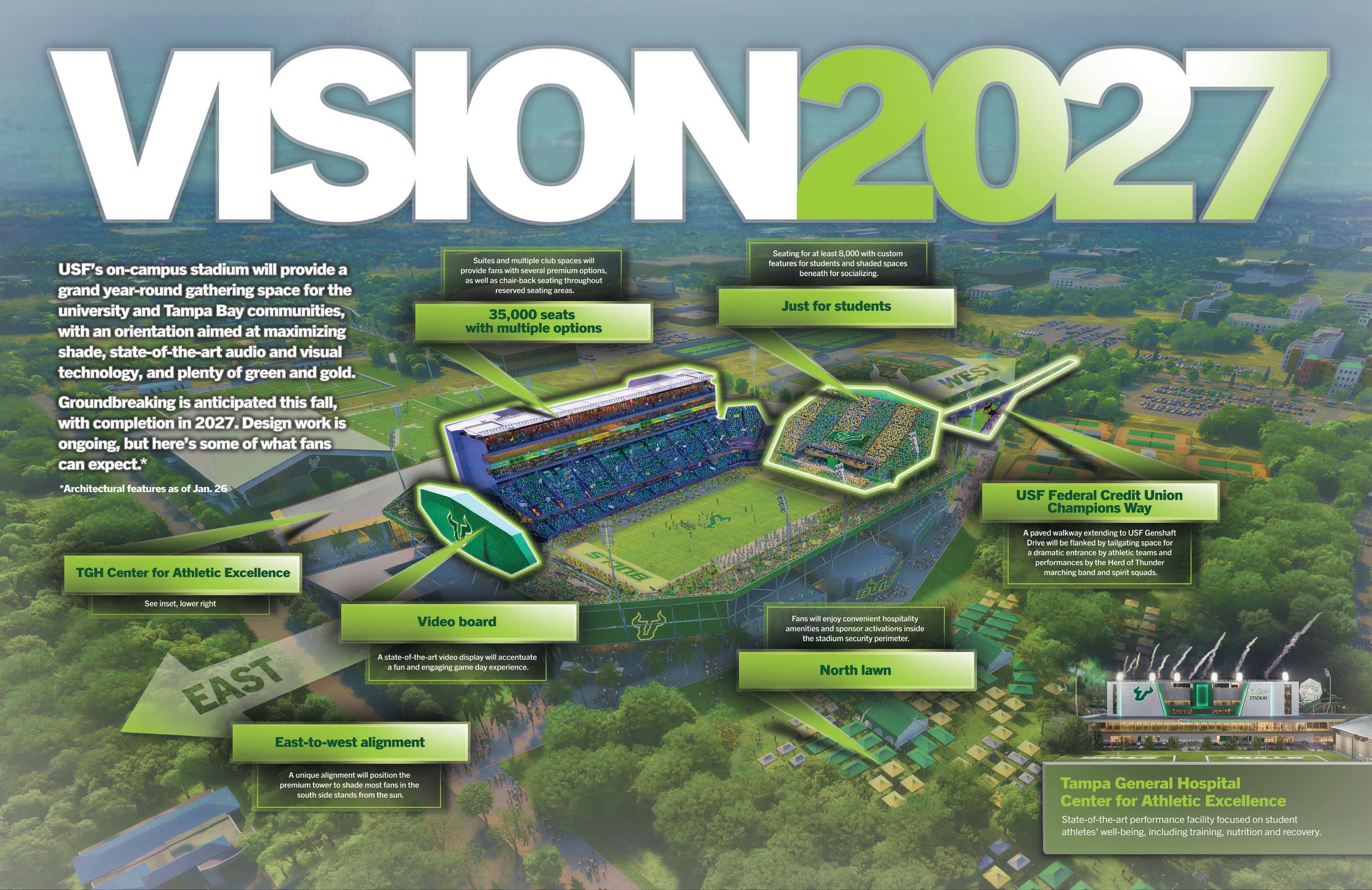 As we celebrate the many accomplishments of our student-athletes, we are also looking ahead to the impact our on-campus stadium will have as the home of our football and other athletics programs and as a venue for concerts, festivals and more. The illustration on pages 22-23 gives you an idea of our plans for the stadium, projected to open in fall 2027. Since we first announced this project, it is the topic I hear about most often from our passionate supporters, who are genuinely excited about what a game-changer this facility will be for our university.