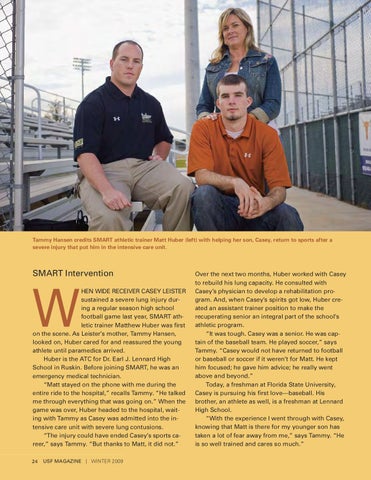 SMART Intervention HEN WIDE RECEIVER CASEY LEISTER sustained a severe lung injury during a regular season high school football game last year, SMART athletic trainer Matthew Huber was first on the scene. As Leister’s mother, Tammy Hansen, looked on, Huber cared for and reassured the young athlete until paramedics arrived. Huber is the ATC for Dr. Earl J. Lennard High School in Ruskin. Before joining SMART, he was an emergency medical technician. “Matt stayed on the phone with me during the entire ride to the hospital,” recalls Tammy. “He talked me through everything that was going on.” When the game was over, Huber headed to the hospital, waiting with Tammy as Casey was admitted into the intensive care unit with severe lung contusions. “The injury could have ended Casey’s sports career,” says Tammy. “But thanks to Matt, it did not.”