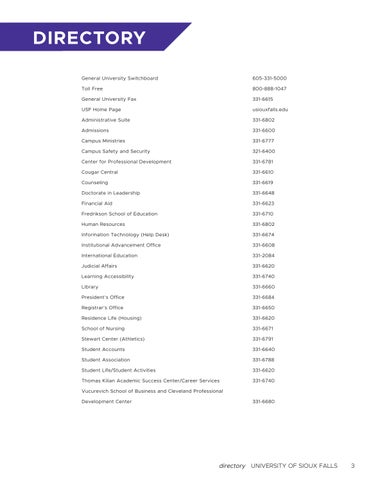 A list of faculty and personnel can be found at: https://usiouxfalls.edu/ directory.