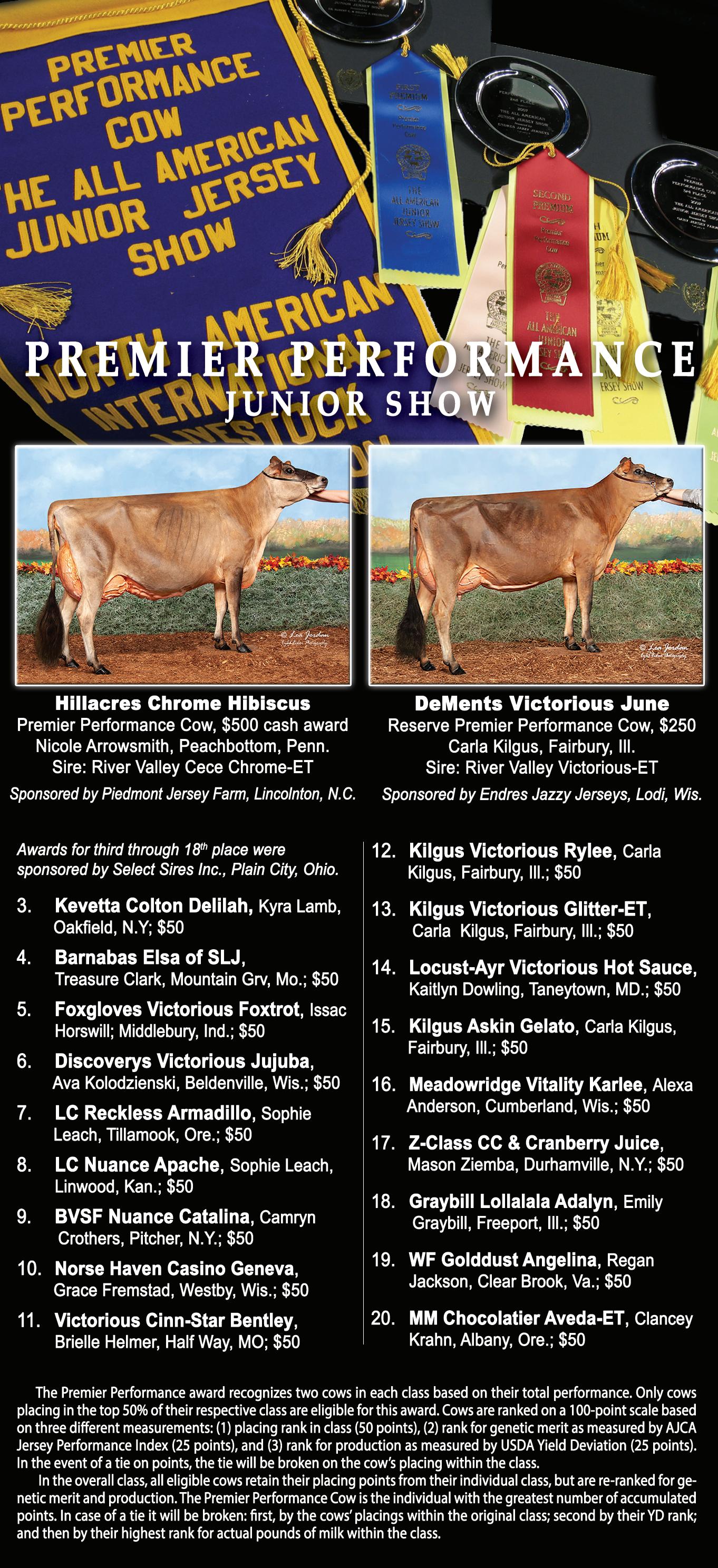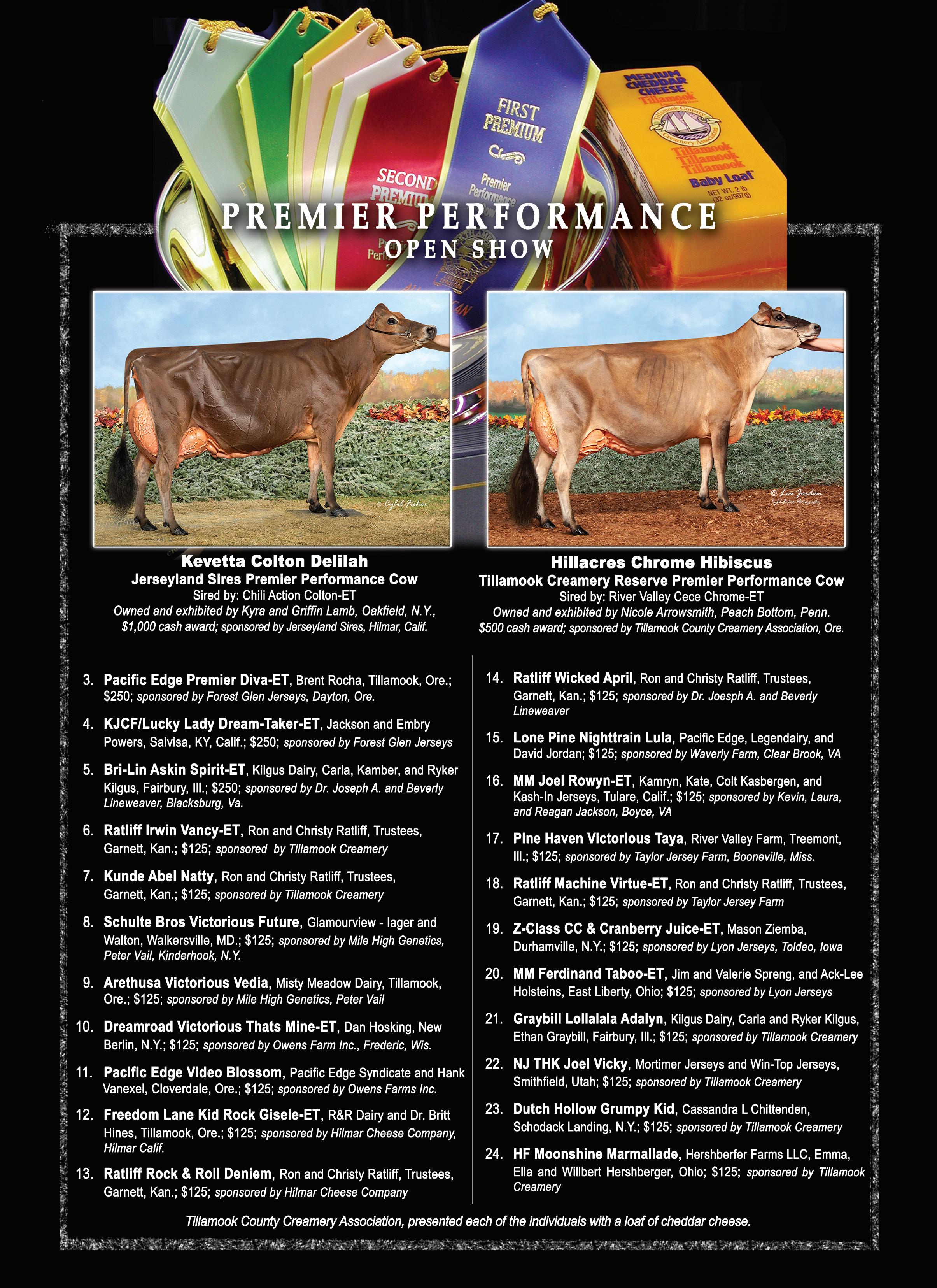 1.Kevetta Colton Delilah, Kyra Lamb, Oakfield, N.Y., best udder, 1st premier performance cow; 2. Barnabas Elsa of SLJ, Treasure Clark, Mountain Grove, Mo., 2nd premier performance cow; 3. Genesis Velocity’s Virtue, Sarah Hill, Bristol, Vt.; 4. Miss Ronde Rosabella-ET, Mia Smith, Elroy, Wis.; 5. Despresverts