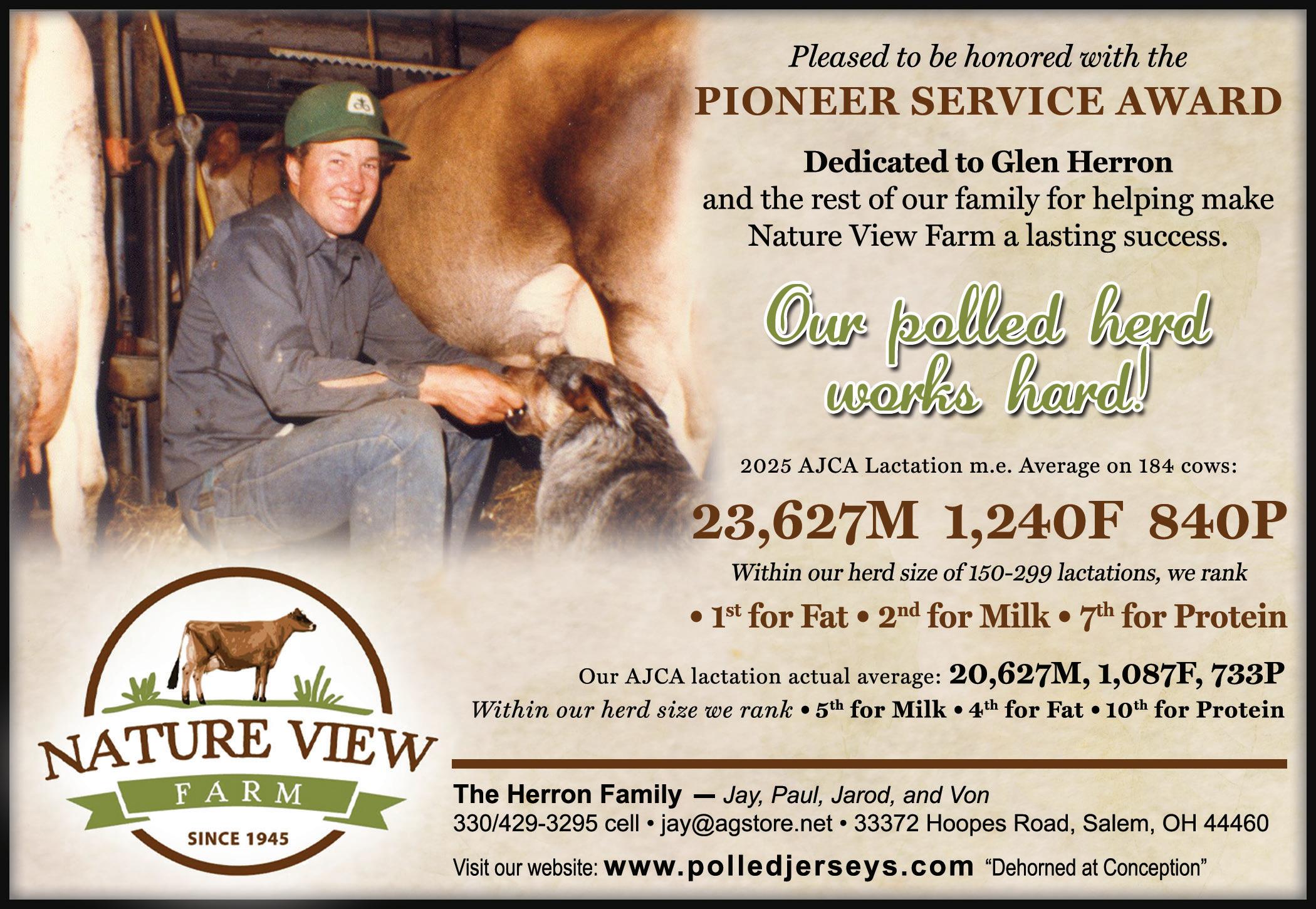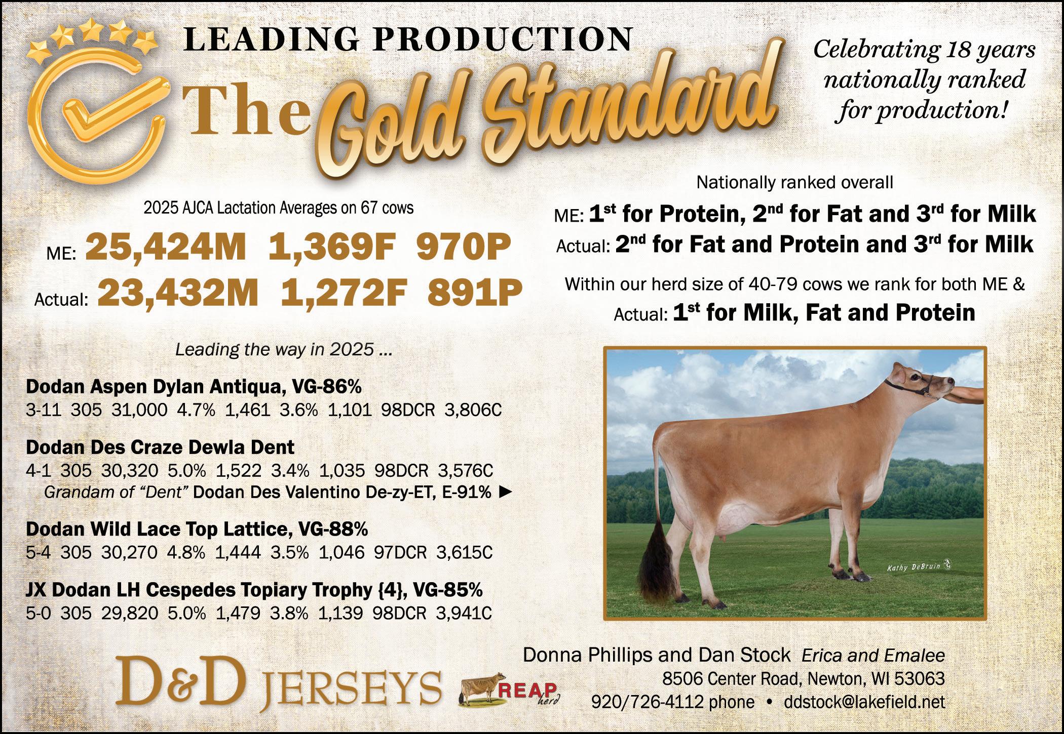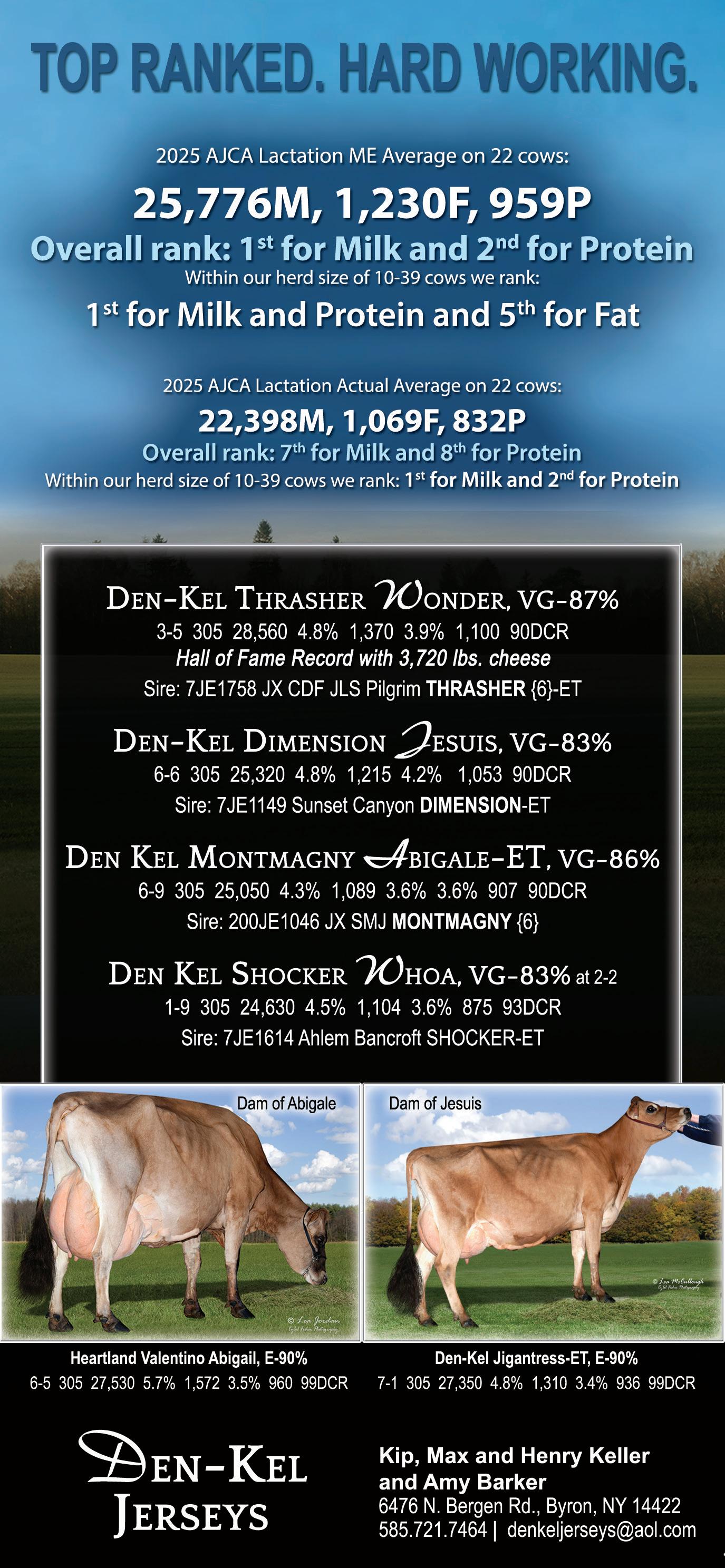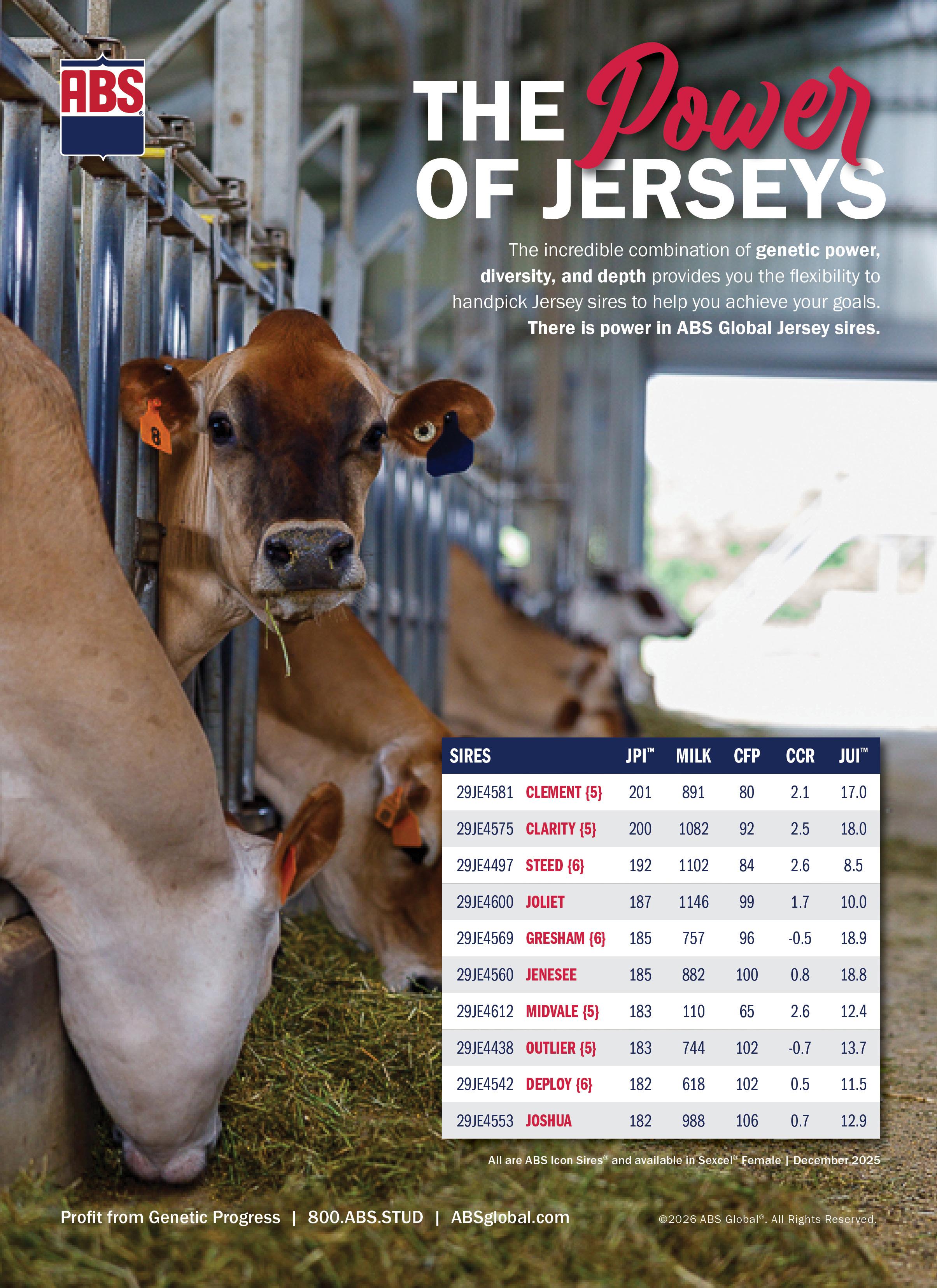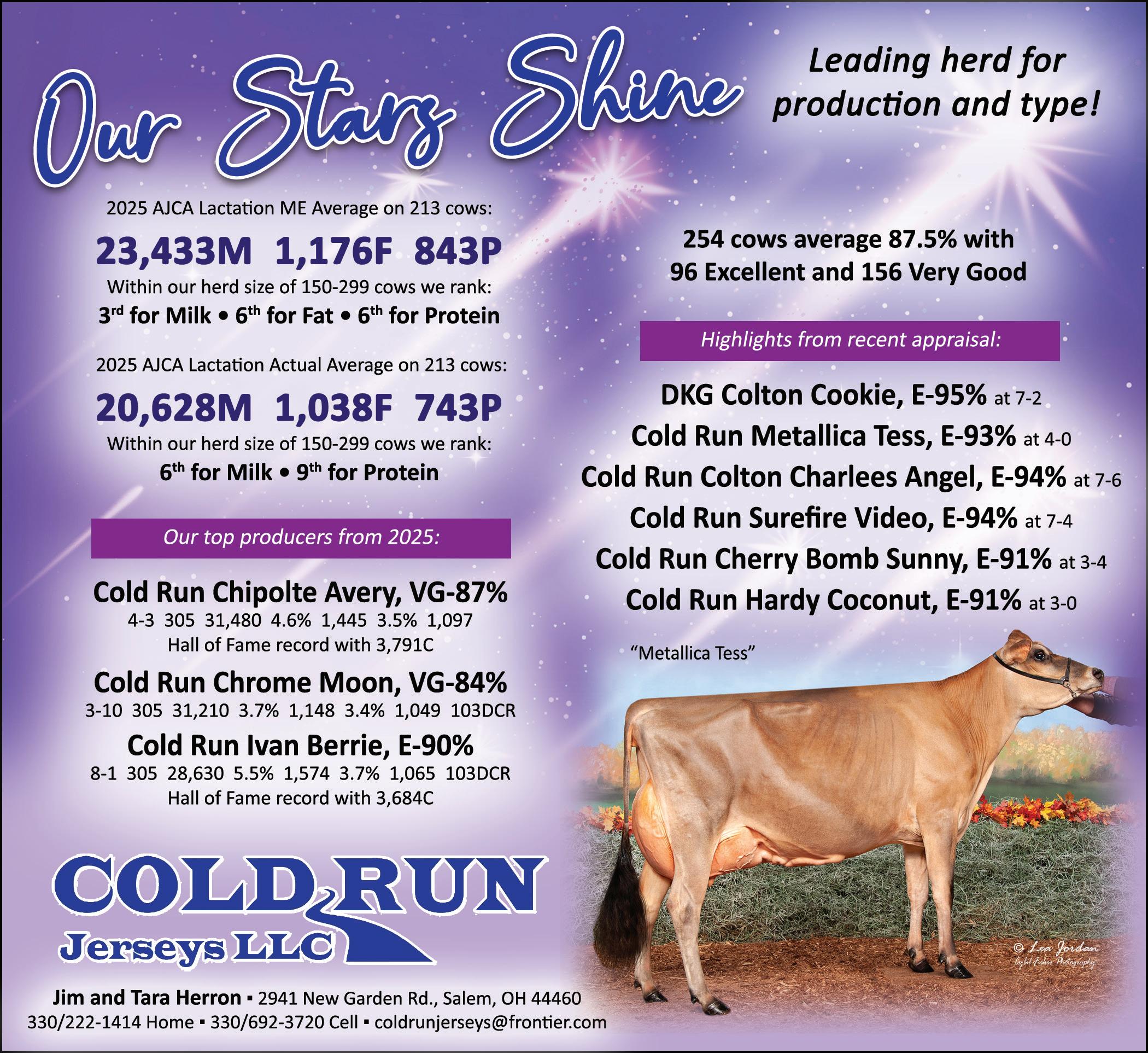 The Shenandoah Jersey herd of Boonsboro, Maryland, graces this month’s cover. Owned by JR and Jessica Stiles Hess and Janet Stiles Fulton, the REAP herd is milked using a DeLaval VMS robotic system and ranks nationally for production. In 2025, the herd achieved an AJCA lactation actual average of 22,674M, 1,053F, and 875P on 45 cows. Jessica was also honored this past year with the AJCA Young Breeder Award. She is a second generation Young Jersey Breeder award winner. Her dad, the late Tracy Stiles, received the award in 1981.