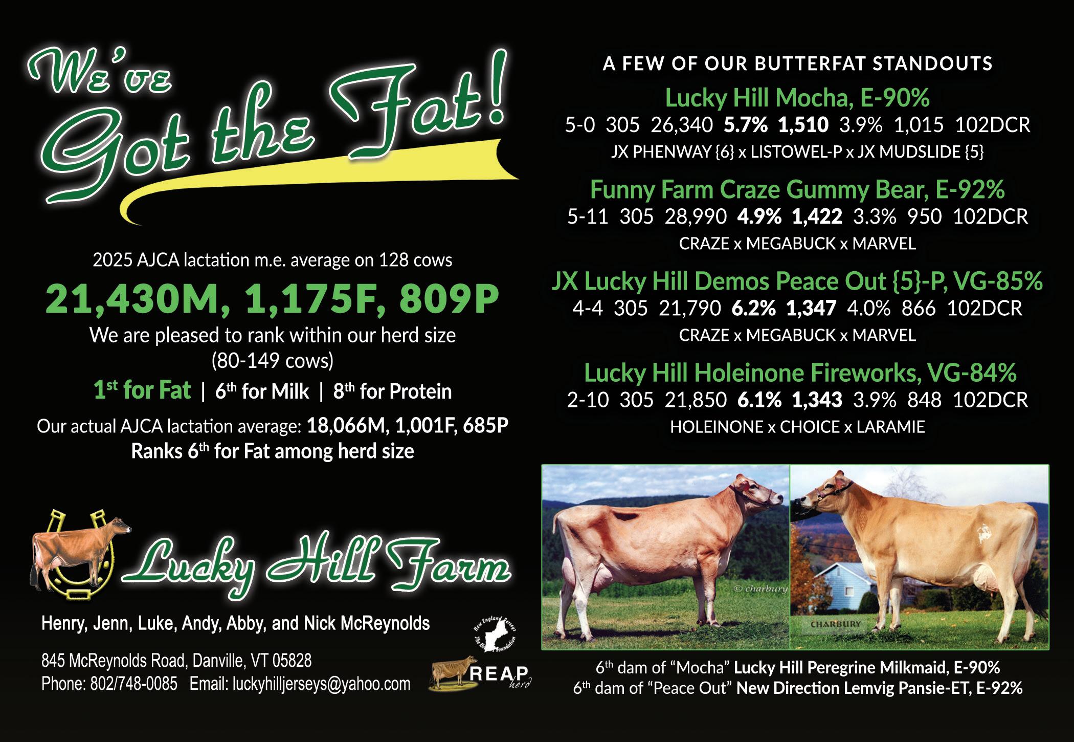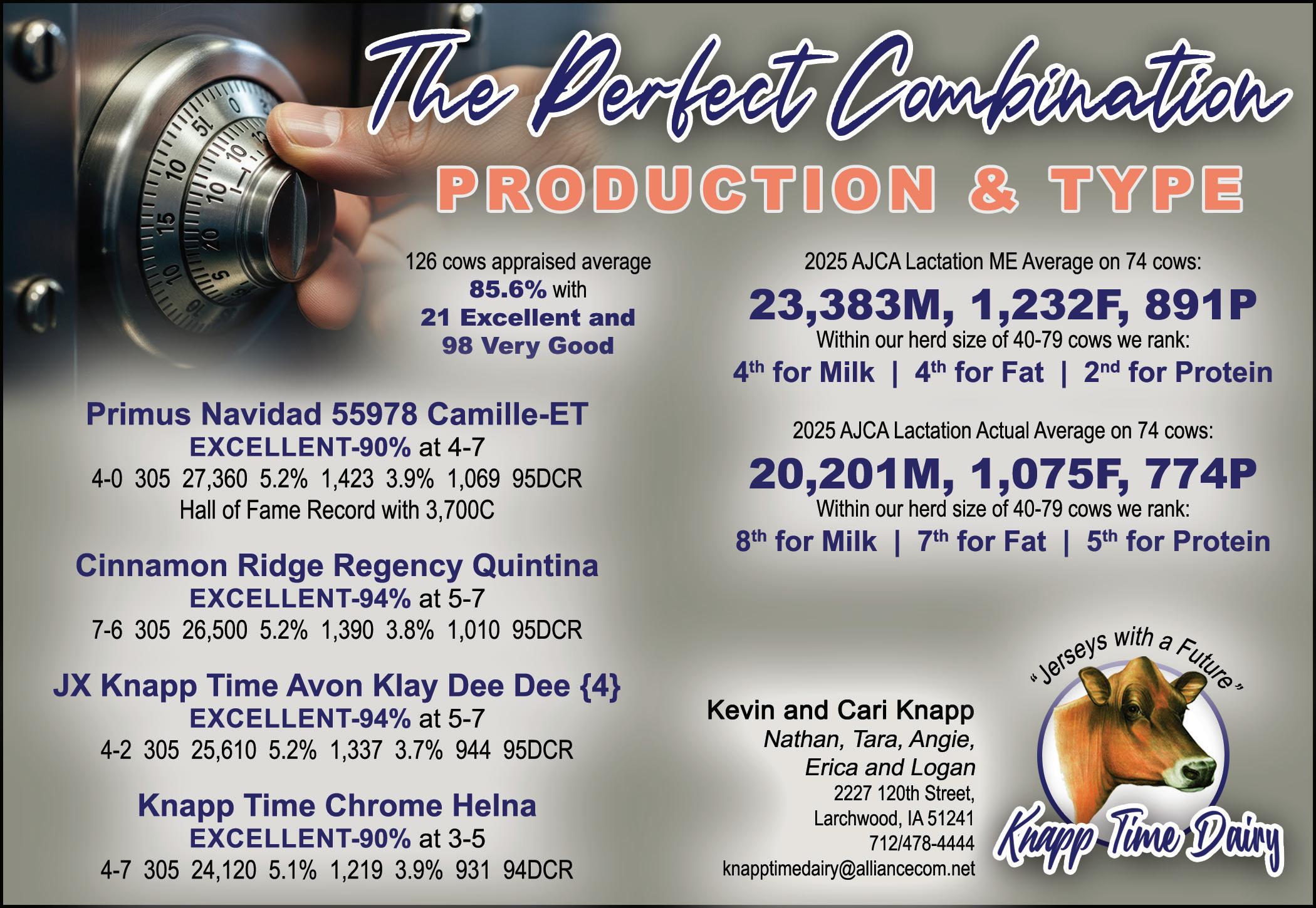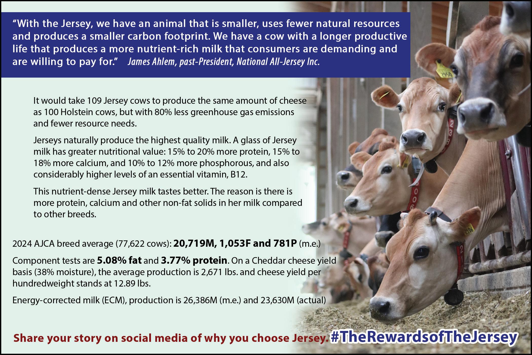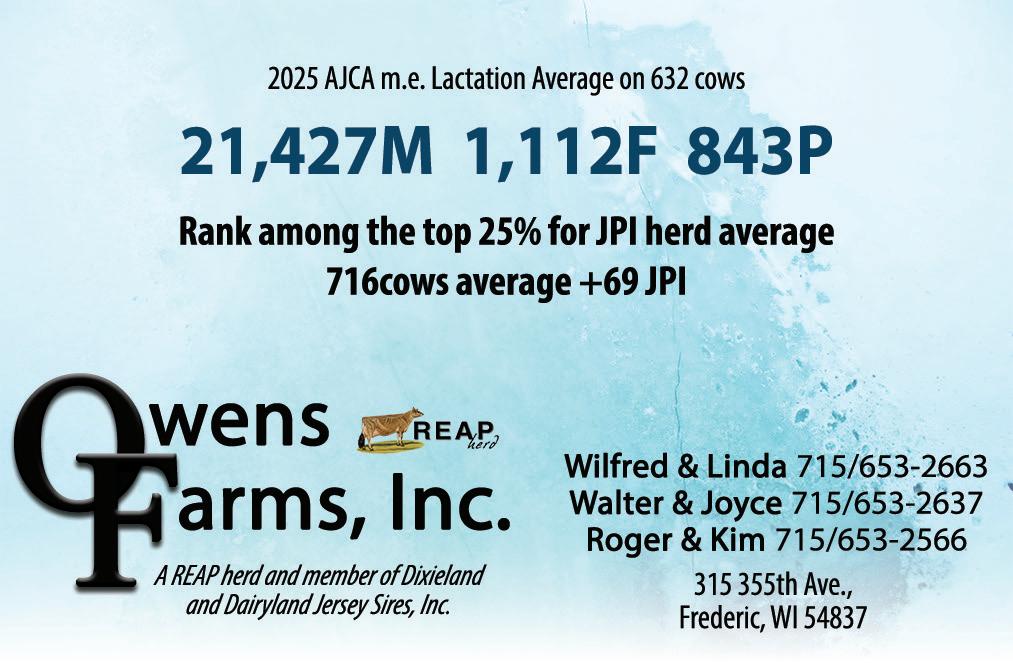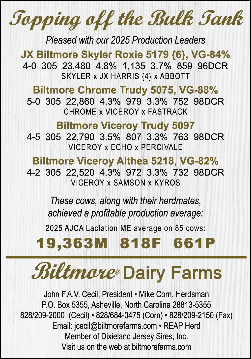 The Shenandoah Jersey herd of Boonsboro, Maryland, graces this month’s cover. Owned by JR and Jessica Stiles Hess and Janet Stiles Fulton, the REAP herd is milked using a DeLaval VMS robotic system and ranks nationally for production. In 2025, the herd achieved an AJCA lactation actual average of 22,674M, 1,053F, and 875P on 45 cows. Jessica was also honored this past year with the AJCA Young Breeder Award. She is a second generation Young Jersey Breeder award winner. Her dad, the late Tracy Stiles, received the award in 1981.