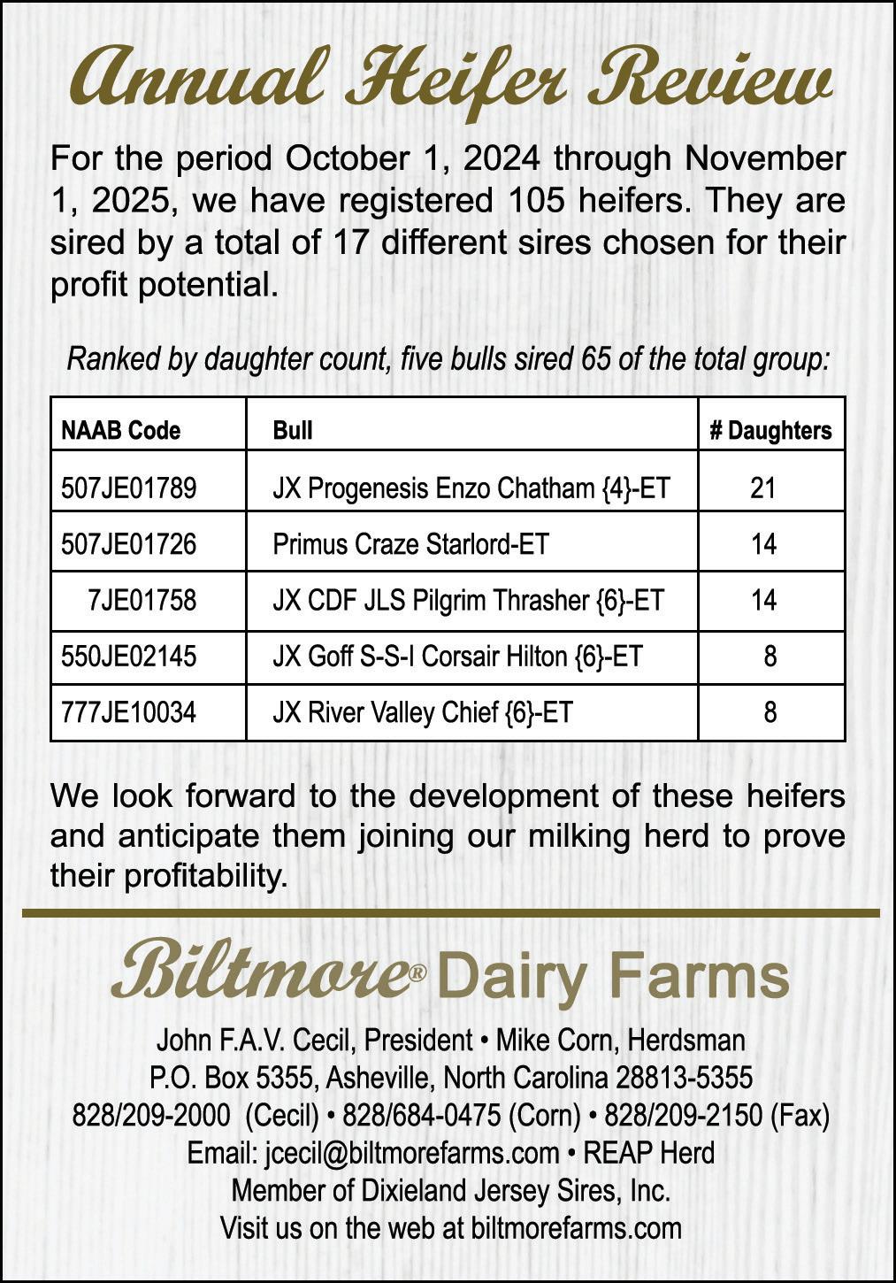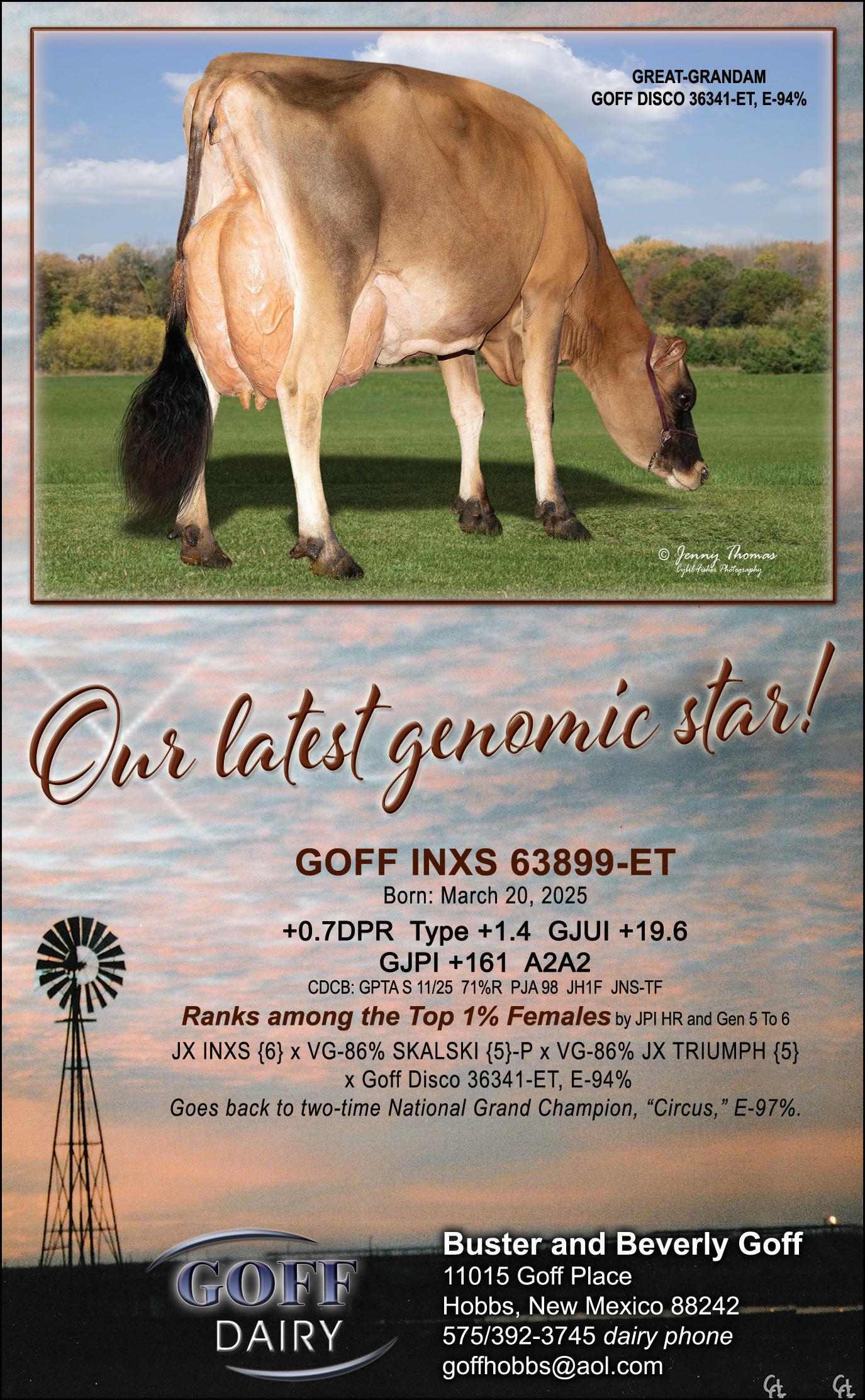Gracing our cover is the breed’s newest Excellent-96% cow, Pacific Edge Premier Diva-ET—bred and owned by Brent Rocha of Tillamook, Ore., and named Best Bred and Owned Female at the 2025 International Jersey Show in Madison, Wis. This issue also brings you reports from Harrisburg’s Mid-Atlantic Jersey Show and the Western National in Oregon. And turn to page 18 for part two of the annual meetings’ genetic roundtable with chat from leading breeders across the United States.