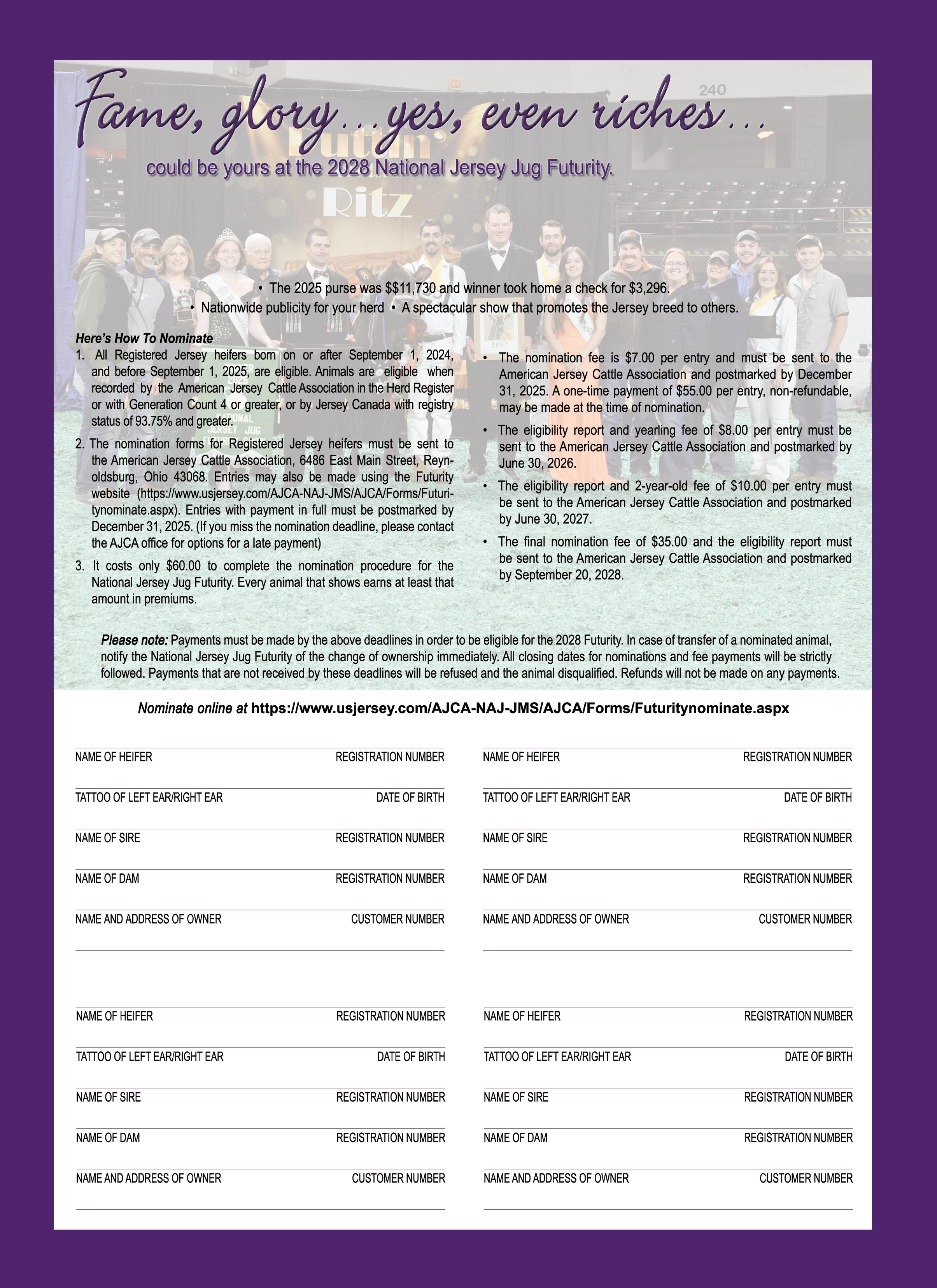 DEC. 31—National Jersey Jug Futurity payments due for 2028 entries.