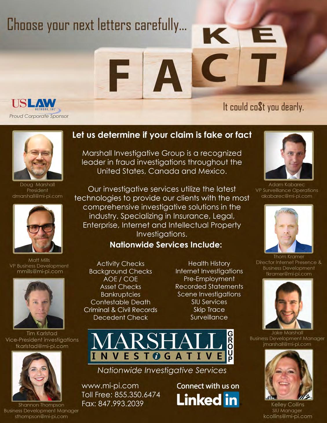 Marshall Investigative Group is a national investigative firm providing an array of services that help our clients mediate the validity of questionable cargo, disability, liability and workers’ compensation claims. Our specialists in investigations and surveillance have a variety of backgrounds in law enforcement, criminal justice, military, business and the insurance industry. Our investigators are committed to innovative thinking, formative solutions and detailed diligence.