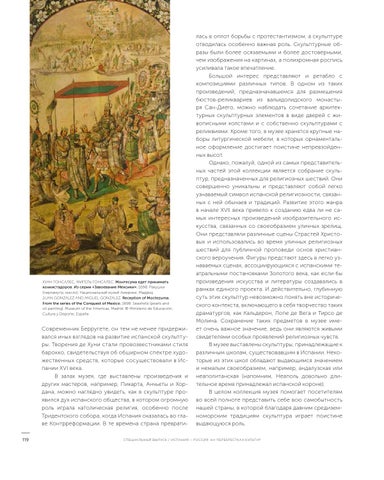лась в оплот борьбы с протестантизмом, а скульптуре отводилась особенно важная роль. Скульптурные образы были более осязаемыми и более достоверными, чем изображения на картинах, а полихромная роспись усиливала такое впечатление. Большой интерес представляют и ретабло с композициями различных типов. В одном из таких произведений, предназначавшемся для размещения бюстов-реликвариев из вальядолидского монастыря Сан-Диего, можно наблюдать сочетание архитектурных скульптурных элементов в виде дверей с живописными холстами и с собственно скульптурами с реликвиями. Кроме того, в музее хранятся крупные наборы литургической мебели, в которых орнаментальное оформление достигает поистине непревзойденных высот. Однако, пожалуй, одной из самых представительных частей этой коллекции является собрание скульптур, предназначенных для религиозных шествий. Они совершенно уникальны и представляют собой легко узнаваемый символ испанской религиозности, связанных с ней обычаев и традиций. Развитие этого жанра в начале XVII века привело к созданию едва ли не самых интересных произведений изобразительного искусства, связанных со своеобразием уличных зрелищ. Они представляли различные сцены Страстей Христовых и использовались во время уличных религиозных шествий для публичной проповеди основ христианского вероучения. Фигуры предстают здесь в легко узнаваемых сценах, ассоциирующихся с испанскими театральными постановками Золотого века, как если бы произведения искусства и литературы создавались в рамках единого проекта. И действительно, глубинную суть этих скульптур невозможно понять вне исторического контекста, включающего в себя творчество таких драматургов, как Кальдерон, Лопе де Вега и Тирсо де Молина. Сохранение таких предметов в музее имеет очень важное значение, ведь они являются живыми свидетелями особых проявлений религиозных чувств. В музее выставлены скульптуры, принадлежащие к различным школам, существовавшим в Испании. Некоторые из этих школ обладают выдающимся значением и немалым своеобразием, например, андалузская или неаполитанская (напомним, Неаполь довольно длительное время принадлежал испанской короне). В целом коллекция музея помогает посетителям во всей полноте представить себе всю самобытность нашей страны, в которой благодаря давним средиземноморским традициям скульптура играет поистине выдающуюся роль.