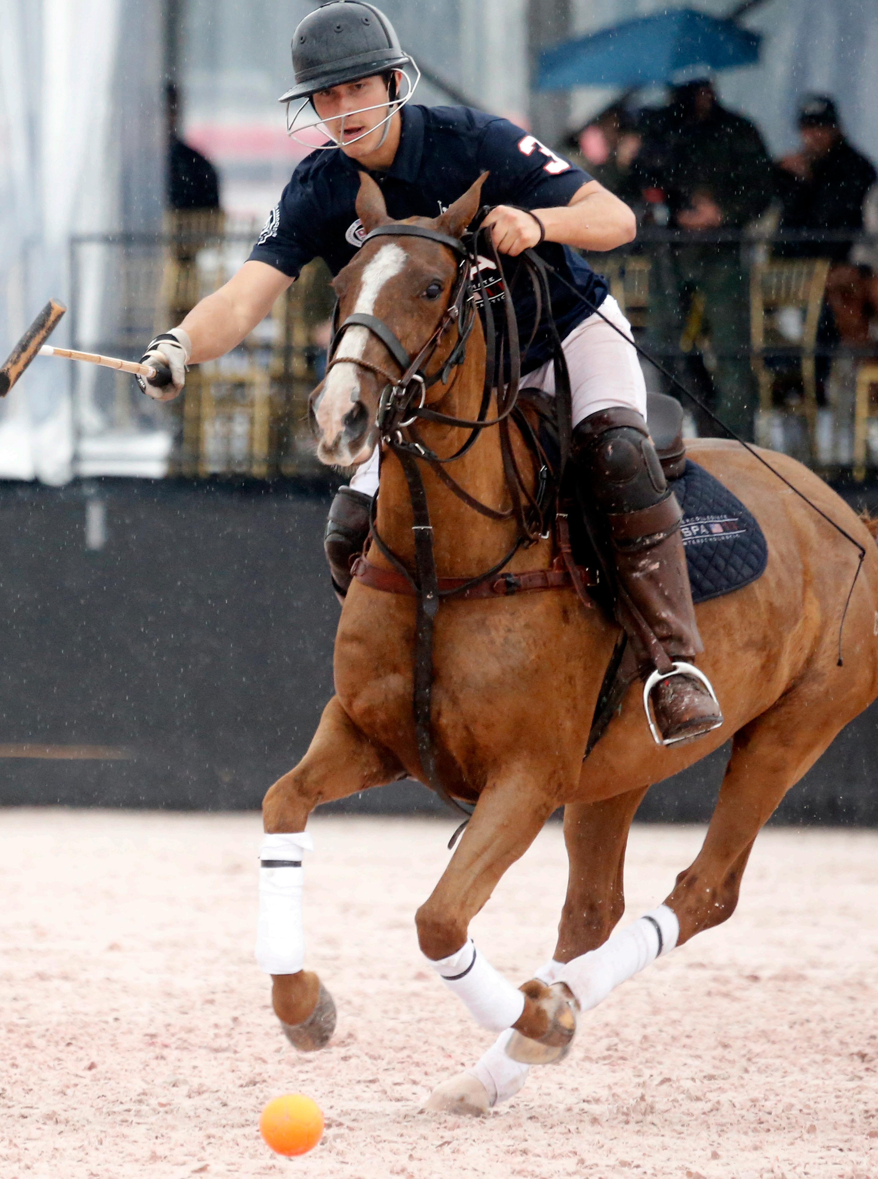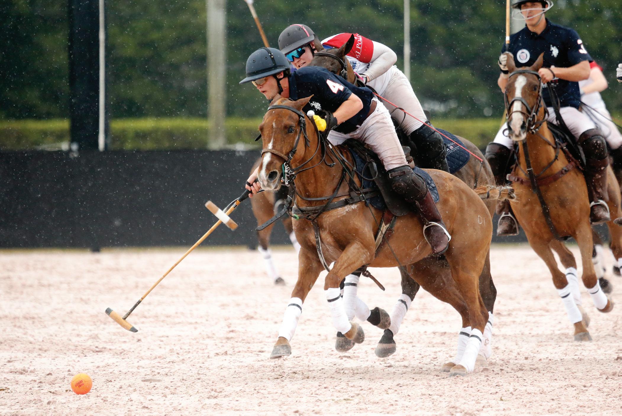 adjust. Even though our injured player could not play, she greatly contributed to our game strategy and supported us off of the field. As we all know, it takes a village between players, horse strings, venue, and more to coordinate a polo match, which involves many off-field components. To me, what happens off the field and in between chukkers can be what makes or breaks an individual, or team, in the game. I would like to highlight and thank our esteemed coaches and mentors for the game; without the wise words of these individuals we could not have performed as we did. Emily Dewey, Tommy Biddle, Pelon Escapite, Steve Krueger, Carlucho Arellano, and Cristina Fernandez all provided Team USA with strategic, mental, and even life advice which lead us to victory. We learned a new trick of the trade as well from Steve Krueger when he gave Liam Lott a rubber dish glove to play with in order to prevent the reins from slipping through his fingers. It was unfortunately pouring down rain for the majority of the match, but the new arena at IPC was well-suited for these conditions and allowed the ball to fly. The match was fast, furious, wet, and so much fun. It is amazing that the USPA streamed this event as well. Unfortunately, my family was unable to attend, but thanks to the livestream, they were all able to watch together in Baltimore, Maryland. The USPA Polo Network also allowed for our opponents’ families to watch from across the pond. What made it the most fun was that we were playing with and against new friends. We were able to spend a lot of time with our team and opponents which was my favorite part of the experience. Establishing connections and sharing such unique experiences with one another creates a newly appreciated level of collaboration beyond