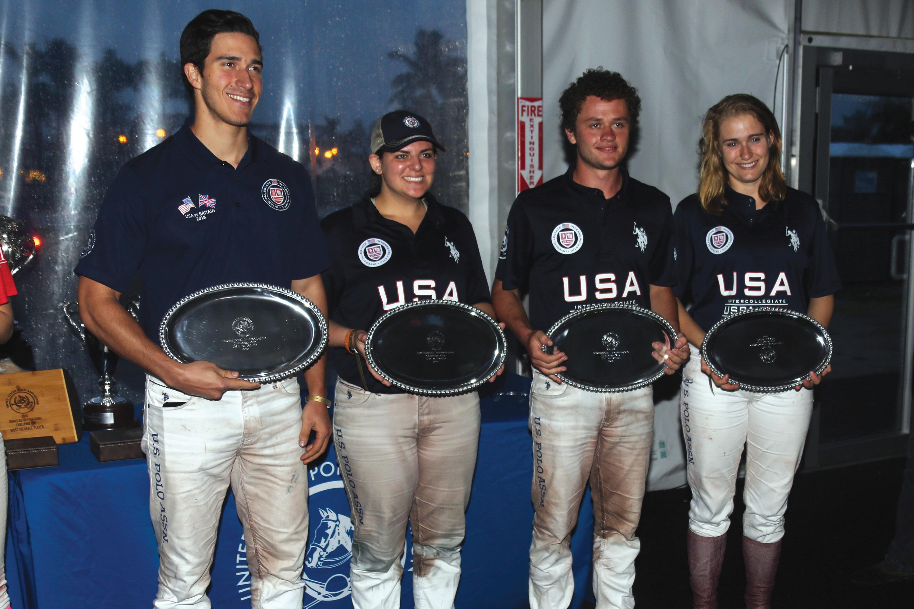 This year, the match took place on January 25, 2019, at the International Polo Club in Wellington, Florida. It was an exciting time as the new arena at IPC was just completed, and because Wellington is the Winter Equestrian Capital of the World. Team USA was comprised of Fiona McBride-Luman from California Polytechnic State University, Liam Lott from Skidmore College, Christian Aycinena from Texas A&M University, and myself from the University of Virginia. Team Britain was comprised of Robyn Evans, James (Sticky) Glew, Jamie Grayson, and Michal Zurawski. The match was good-natured and extremely competitive. The USPA and Dardo Iglesias provided us with incredible mounts. My favorite horse was Anna, who I rode in the last chukker. Team USA came out of the gates slightly flat-footed and unfortunately one of our players had a bad fall and was unable to continue the match. The way that our mentors, teammates and opponents handled the situation was with a caring nature, patience and support. Having started a little slow, being a man down with the four-man rotation, and playing against top collegiate competitors, we had to