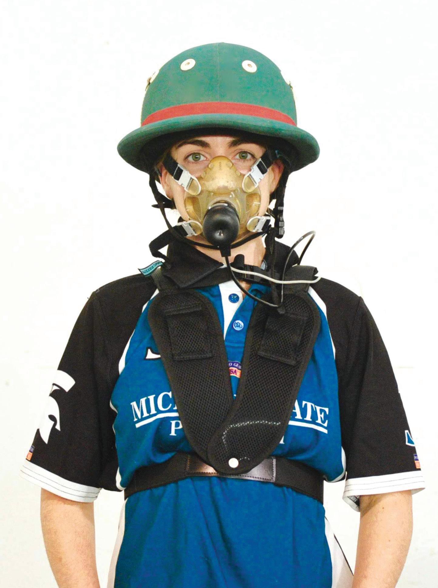 Not surprisingly, there were a lot of challenges associated with setting up and using this specialized equipment in a polo setting. “Being in charge of organizing the study, and having to set up the equipment, was definitely the most challenging aspect” said Pritchard. “The equipment was borrowed from the MSU Kinesiology department, and it took a little while to figure out how to set it up and get it working properly in a barn environment filled with horses. This equipment had never really been used outside of a laboratory setting.” Things didn’t get any easier for the participants wearing the equipment. All MSU Polo Club members who participated in the study agreed that they had to re-adjust their entire swing while riding and wearing the equipment; the mask especially was very bulky, and restricted players’ vision of the arena, and even the ball, at times.