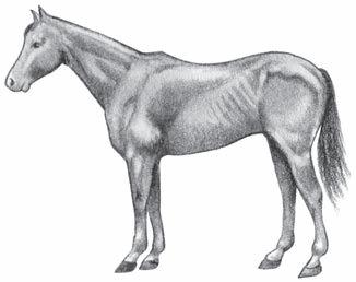 Animal emaciated; slight fat covering over base of spine; ribs, tailhead, points of hip and buttock prominent; withers, shoulders, and neck structure faintly discernable.