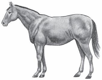 Back is flat (no crease or ridge); ribs not visually distinguishable but easily felt; fat around tailhead beginning to feel spongy; withers appear rounded over spine; shoulders and neck blend smoothly into body.