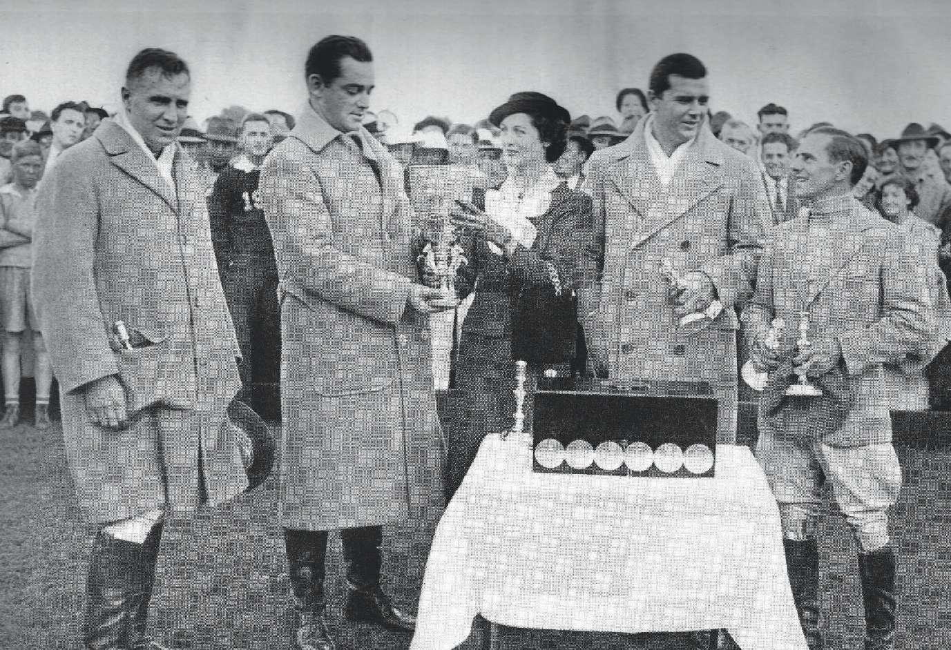 Mrs. Jack D. Nelsen presents the Open trophy to Greentree’s captain John Hay Whitney. The other players were Thomas Hitchcock Jr., Gerald Balding and George H. Bostwick. The team won the Open and the right to represent USA in the Cup of the Americas against Argentina.
