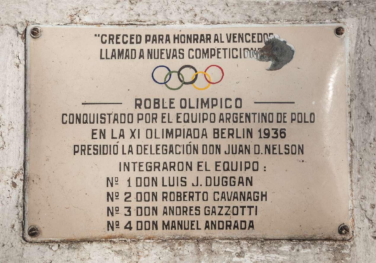 The plaque placed under the majestic oak reads: Grown to honor the winner of the new competition; Olympic Oak; conquered by the Argentine Polo team in the XI Olympiad Berlin 1936; Juan D. Nelson presided over the delegation.