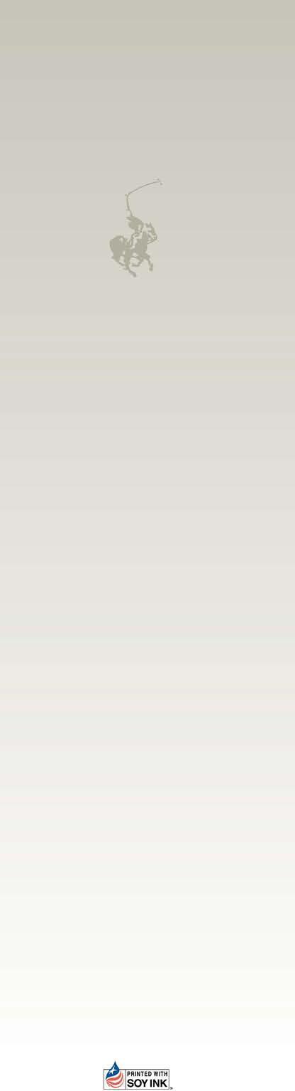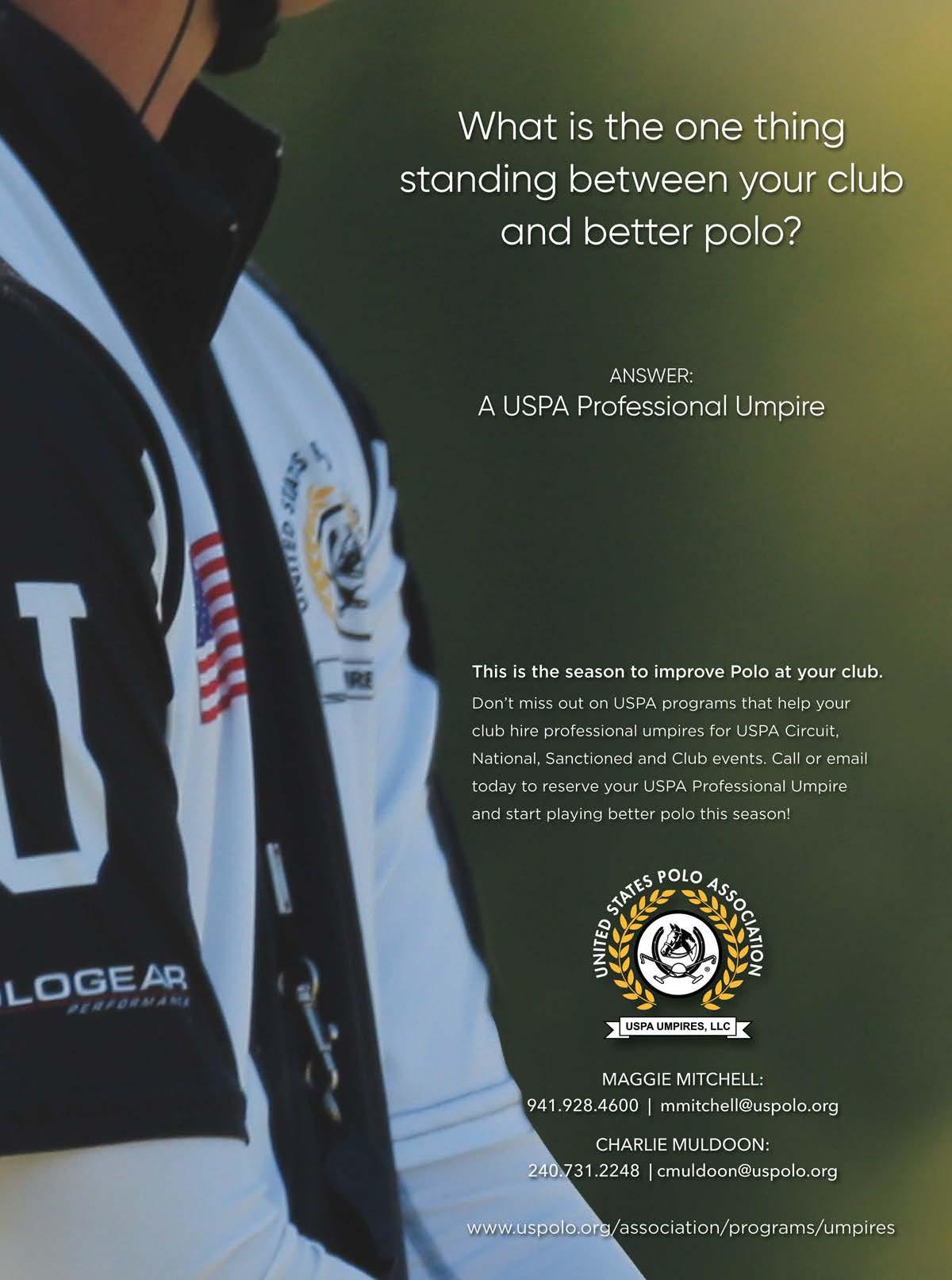 POLO Players’ Edition (ISSN #1096-2255) is published monthly by Rizzo Management Corp. 6008 Reynolds RD, Lake Worth, FL 33449 for U.S. Polo Association, 9011 Lake Worth RD, Lake Worth, FL 33467. Periodicals postage paid at West Palm Beach, FL and additional mailing offices. (USPS: 079-770).