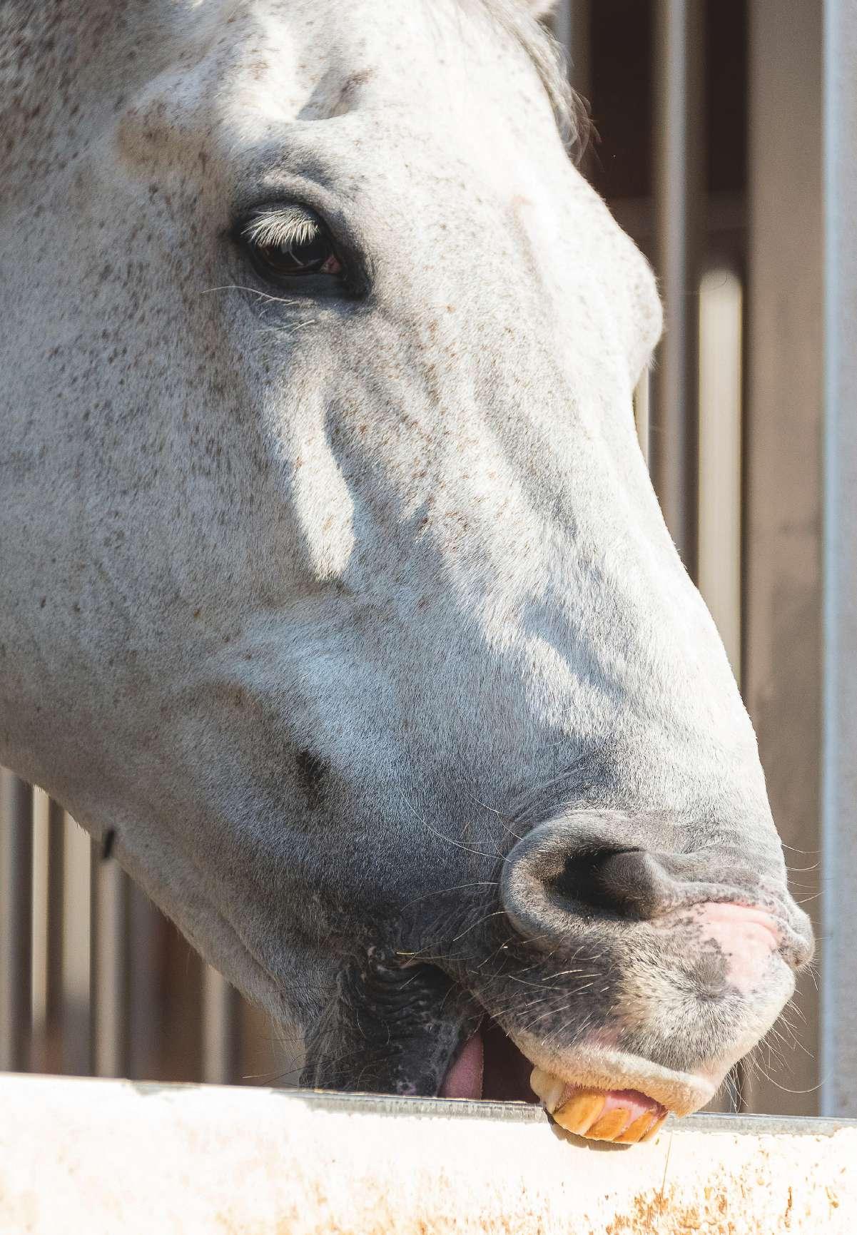If you watch cribbers, right before they set their teeth on the fence board or side of the stall, many of them exhibit a lot of oral behavior. “They tend to lick and chew just before they actually set their teeth. Some of the horses that live in stalls, if you put a collar on they stop cribbing momentarily because they can’t expand the larynx and stretch their neck out to try to perform the behavior, but they almost always redirect the behavior into some other form of stereotypic activity. They may start to head toss, weave or walk the stall.” They seem to have a need to express that energy in some way.