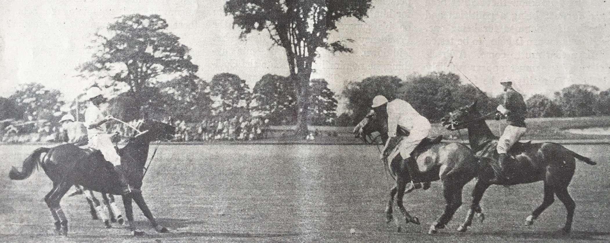 The lefty J. Watson Webb (about to hit the ball) played No. 1 for the old team. Tommy Hitchcock (directly behind him) also played on the team. The Sands Point Club put on matches every Sunday for the Big Four aspirants to be tested prior to the team being named.