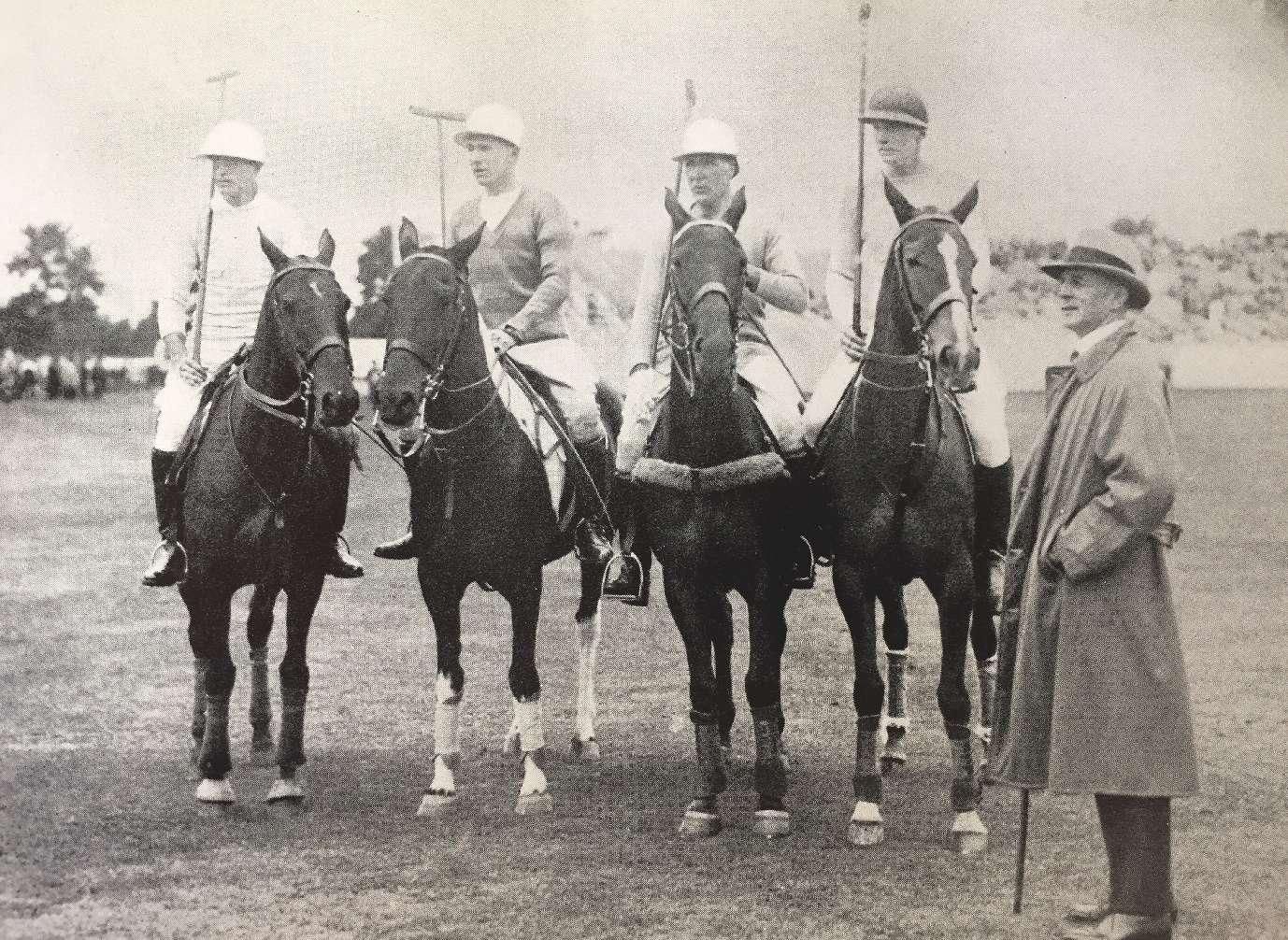 Louis Stoddard stands with Averell Harriman, Tommy Hitchcock Jr., Malcolm Stevenson and Winston Guest, the team in the first two matches of the International Championship.