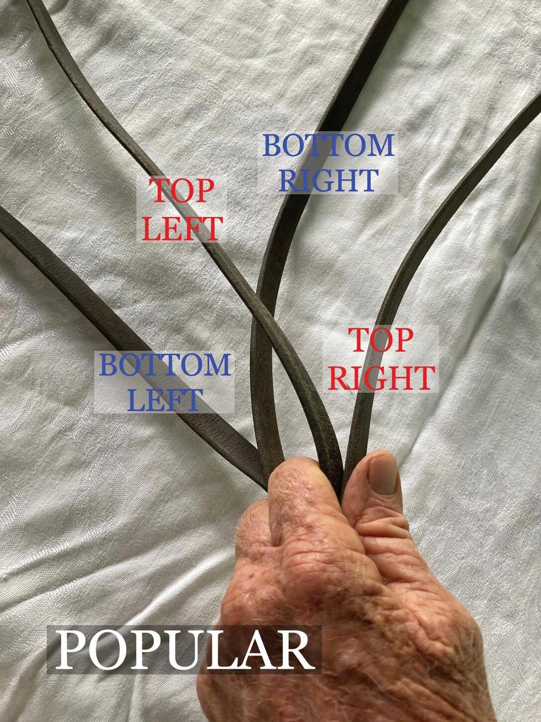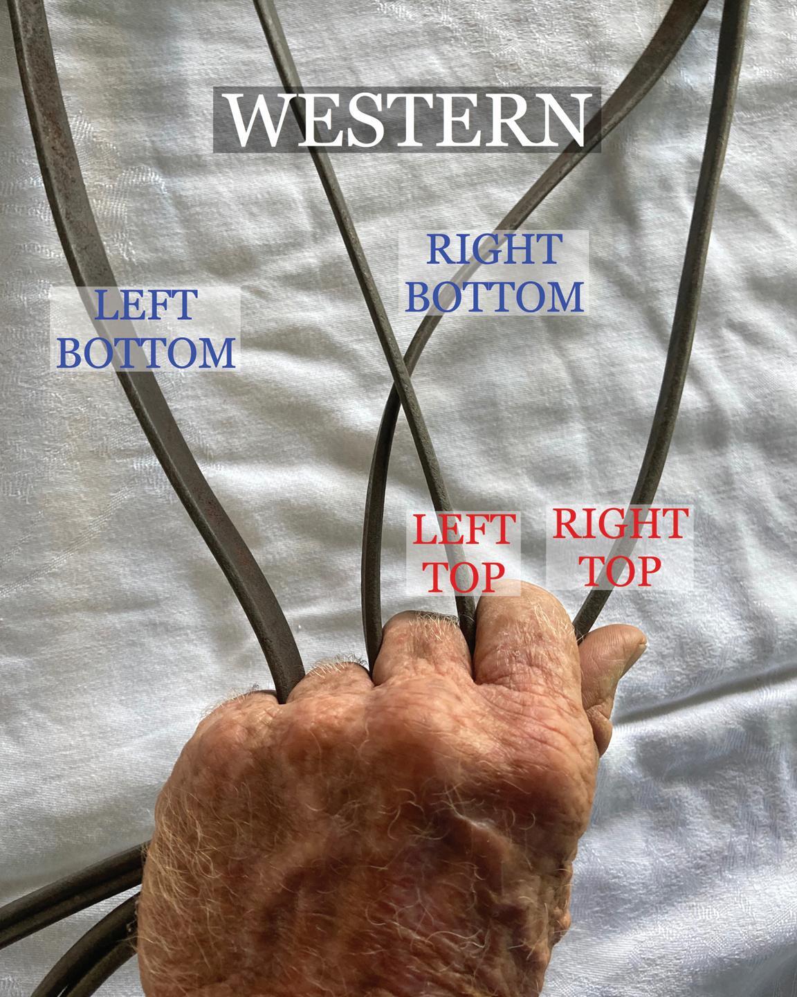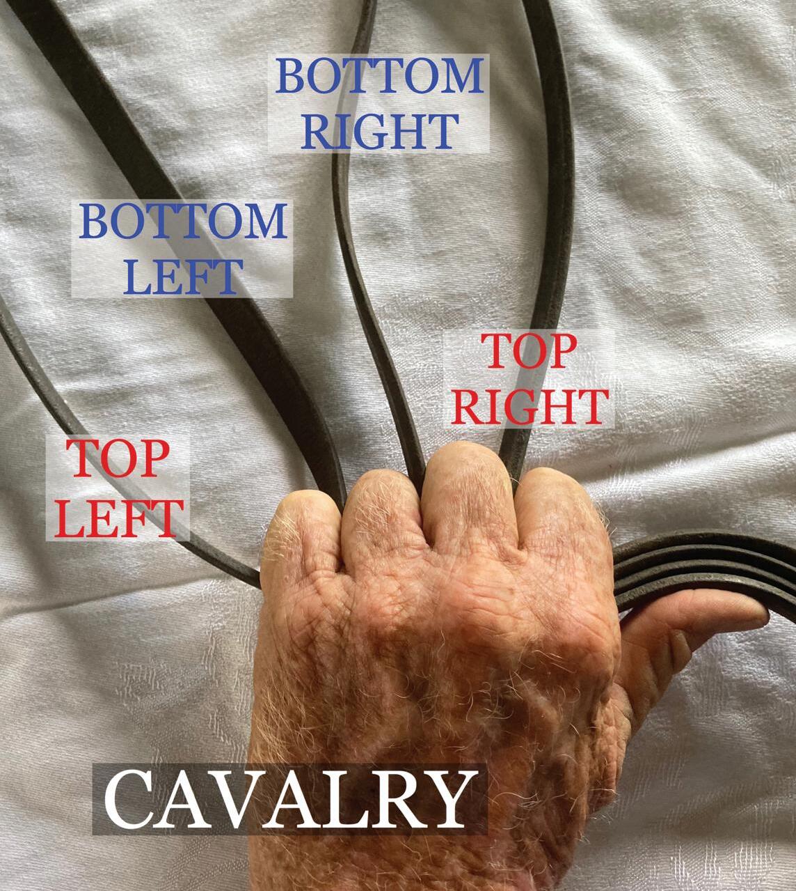 The other two methods I’m going to focus on are the “cavalry style” and the “western style.” The cavalry style was used almost exclusively in the old days so soldiers could guide and control their mounts with one hand and use a pistol, sword, spear or other weapon in the other. Here, one rein sits between each finger with the top left rein around the pinkie. The rider’s palm faces down, and the end of the reins exit between the index finger and thumb. This style usually has the top reins on the outside and the bottom reins in the middle.