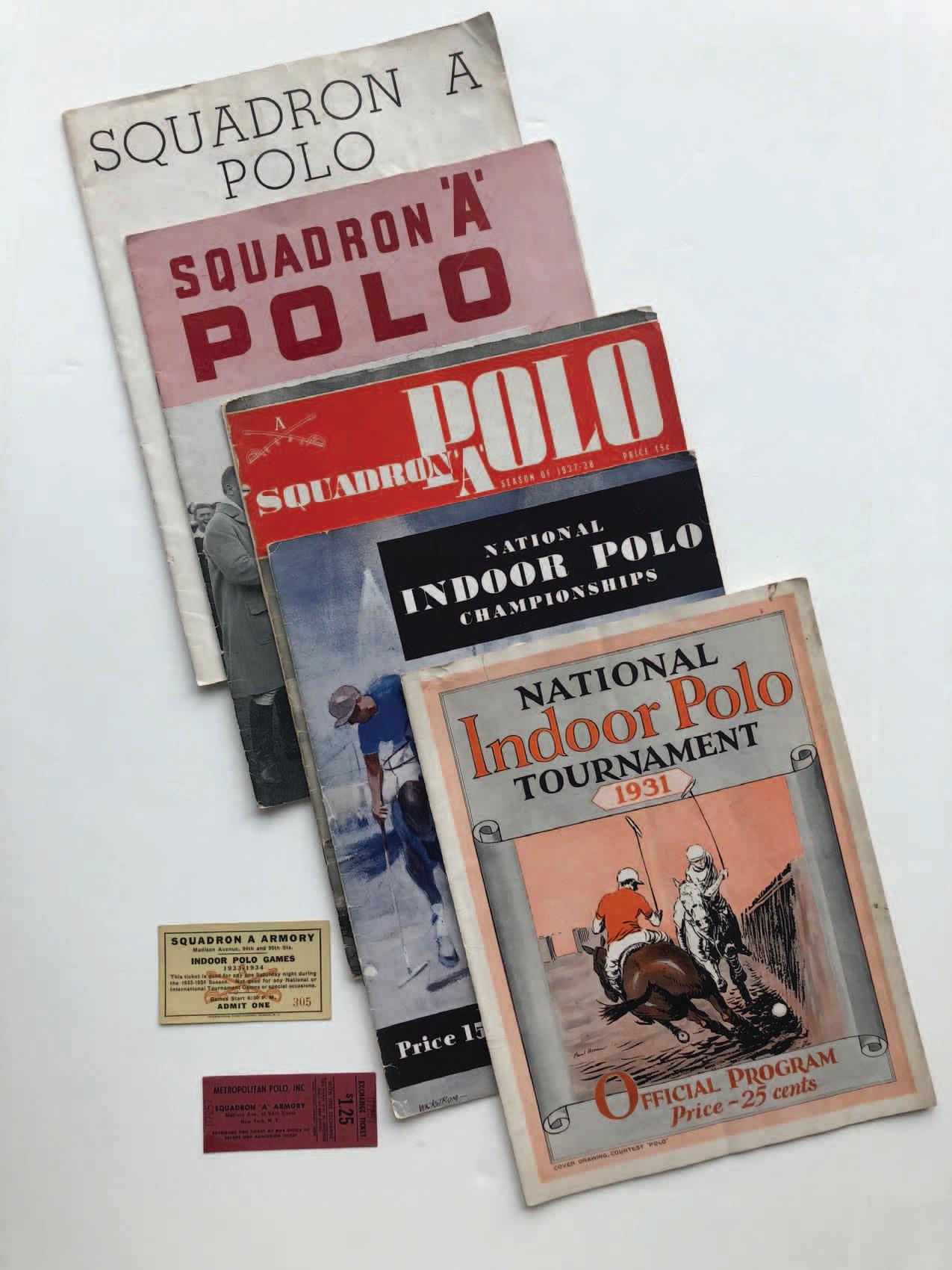 In the 1930s, the indoor polo championship games were either played at Squadron A in New York or at the 124th Field Artillery Armory in Chicago. The Argentines played at the 1930 games in New York. Featured here are period programs and tickets from Squadron A.